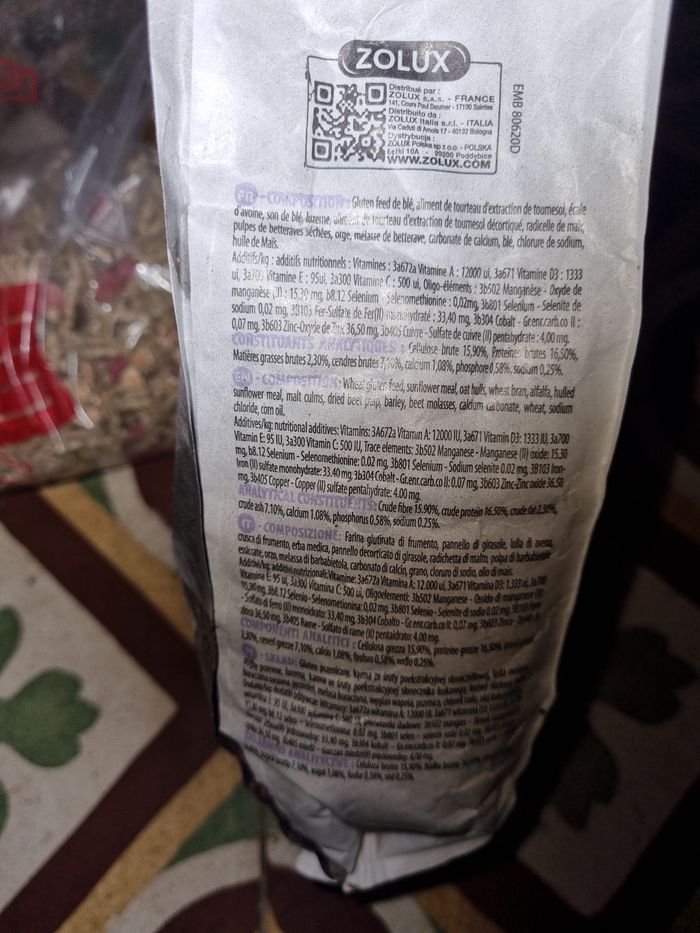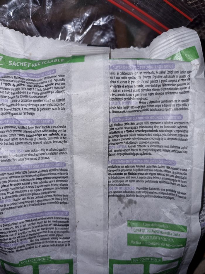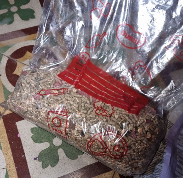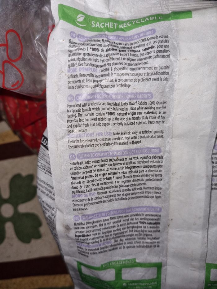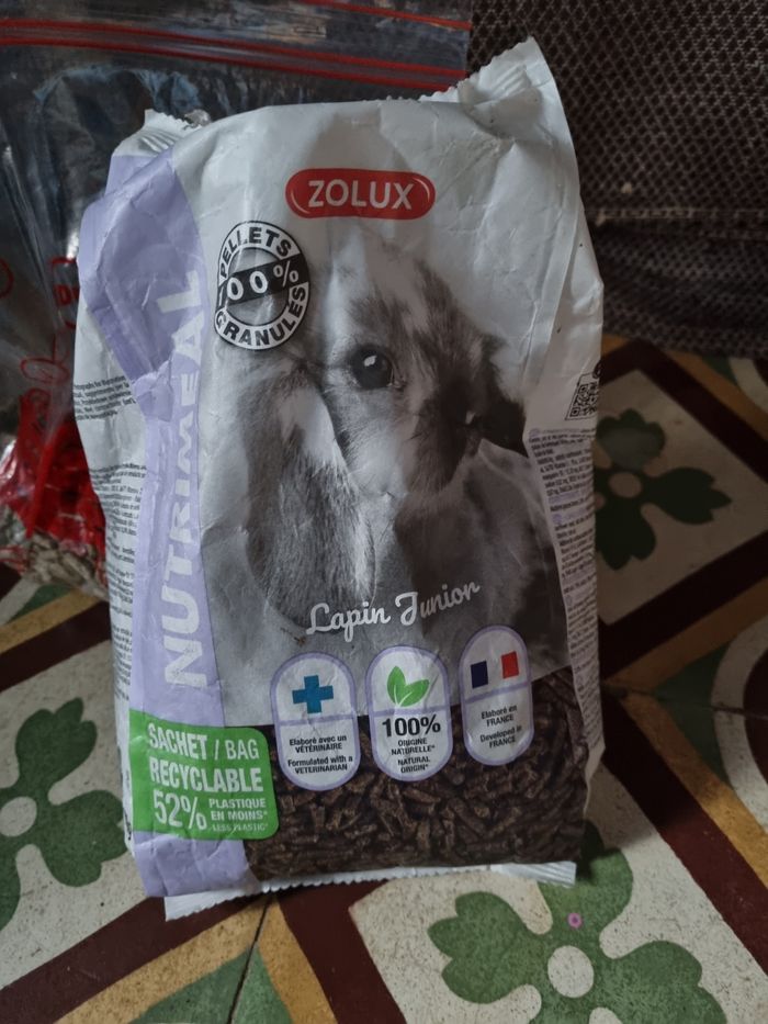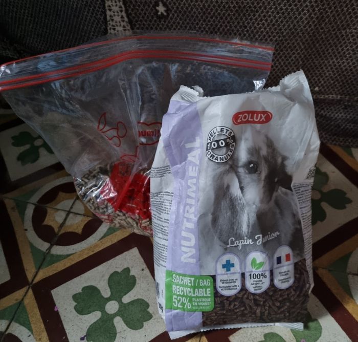Lot granulés lapin junior sachets de 800g, marque Zolux, un sachet neuf et un sachet qui avait été ouvert mais le lapin ne les aimais pas.