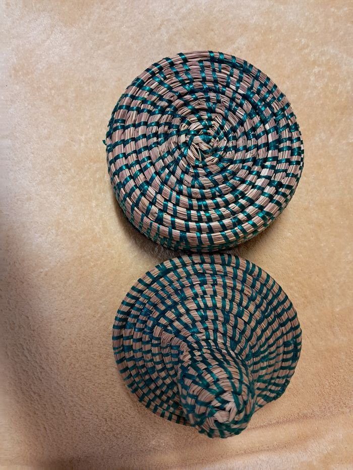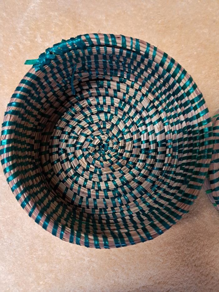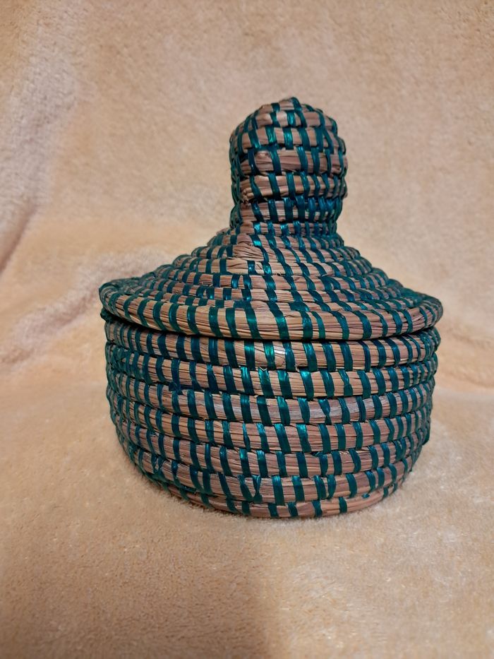 Boîte vintage en osier Fils plastiques colorés Diamètre 12,5 cms Réductions lots activées