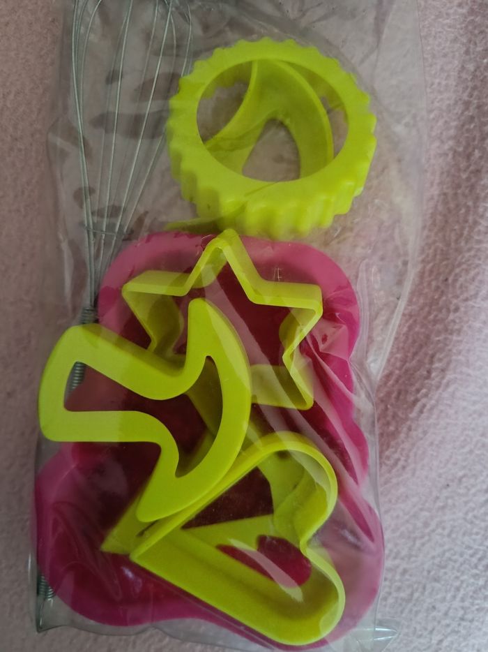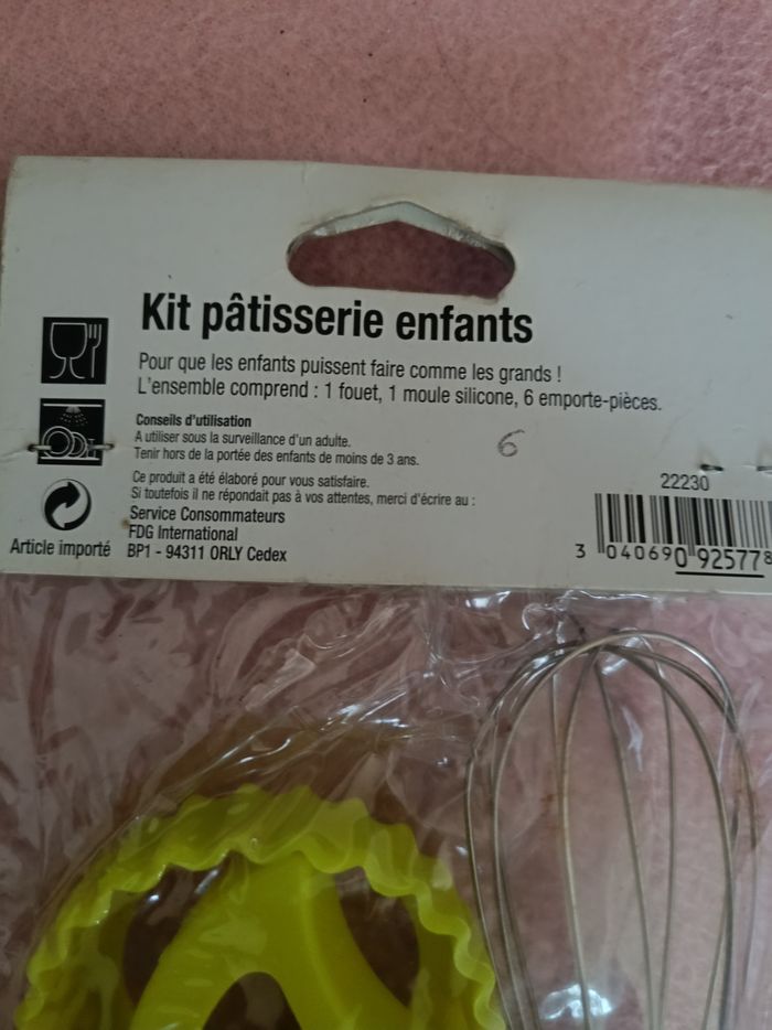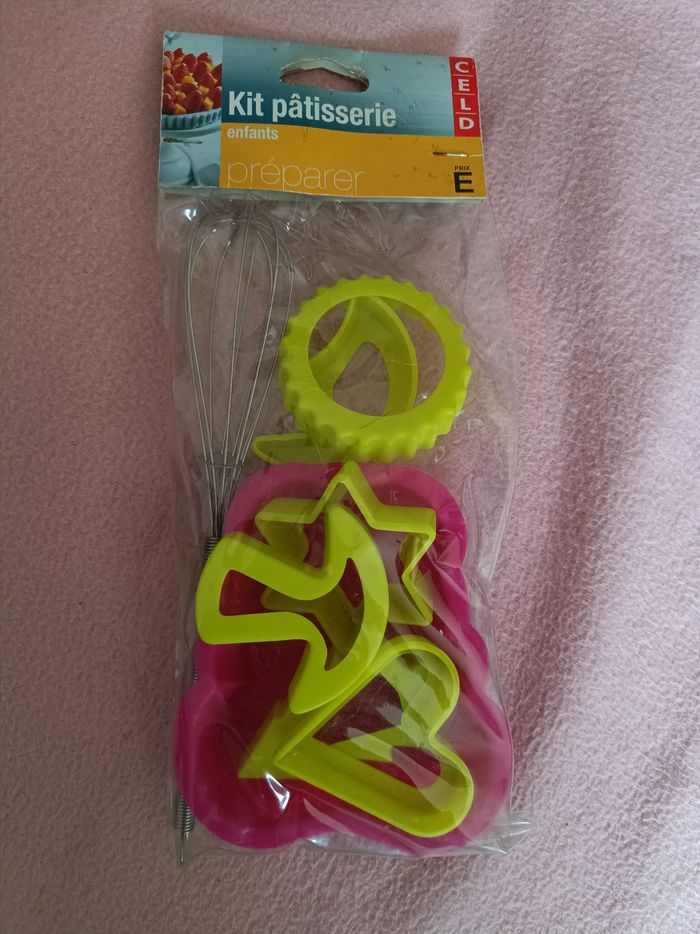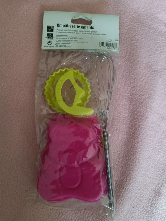 Petit kit de pâtisserie enfants. Contenus : 1 fouet, 1 moule en silicone et 6 emporte-pièces. Neuf, jamais utilisé.