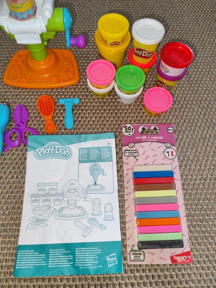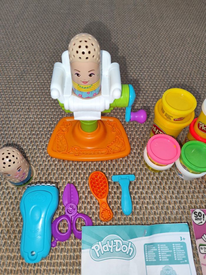Le salon de coiffure Play-Doh , complet avec accessoires et notice d'utilisation ( sans la boite d'origine ) , la tondeuse émet un son lorsqu'elle touche la pâte à modeler ( fonctionne avec 2 piles LR03 fournies ) + 1 lot de 12 bâtonnets de pâte à modeler , neufs sous blister et 1 lot de 11 boites vides pour y ranger les bâtonnets , lot en très bon état . N'hésitez pas à me demander d'autres photos ou infos complémentaires et à consulter mes autres ventes .