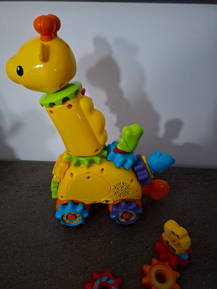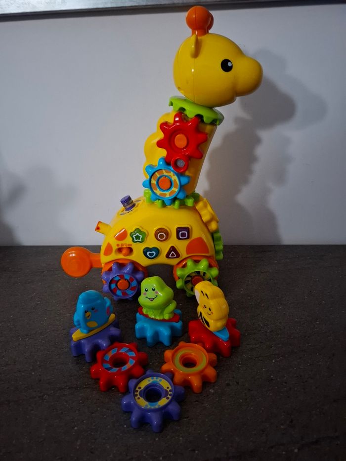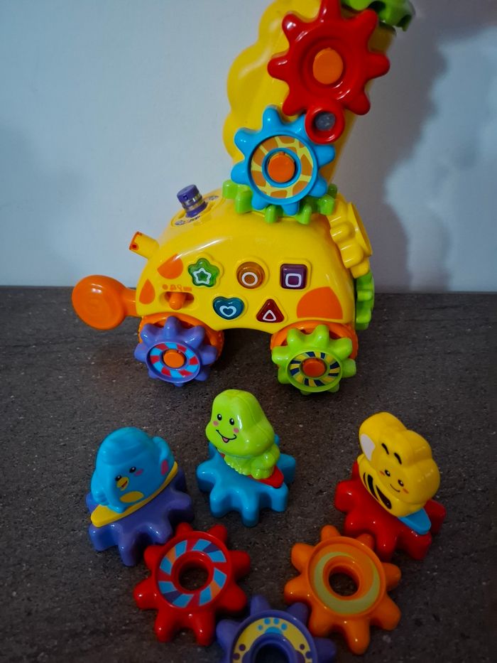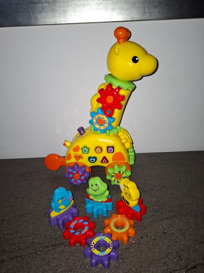 En parfait état Marque V Tech De 18 mois à 4 ans Une girafe interactive à pousser avec 5 touches lumineuses pour découvrir les formes et les notes de musique et s'initier à l'anglais. 10 engrenages magiques à connecter pour créer des réactions amusantes Chaque engrenage est reconnu par la girafe et déclenche une réaction unique et des effets lumineux ! L'engrenage manivelle permet de déclencher des réactions en chaîne 5 chansons et 10 mélodies.