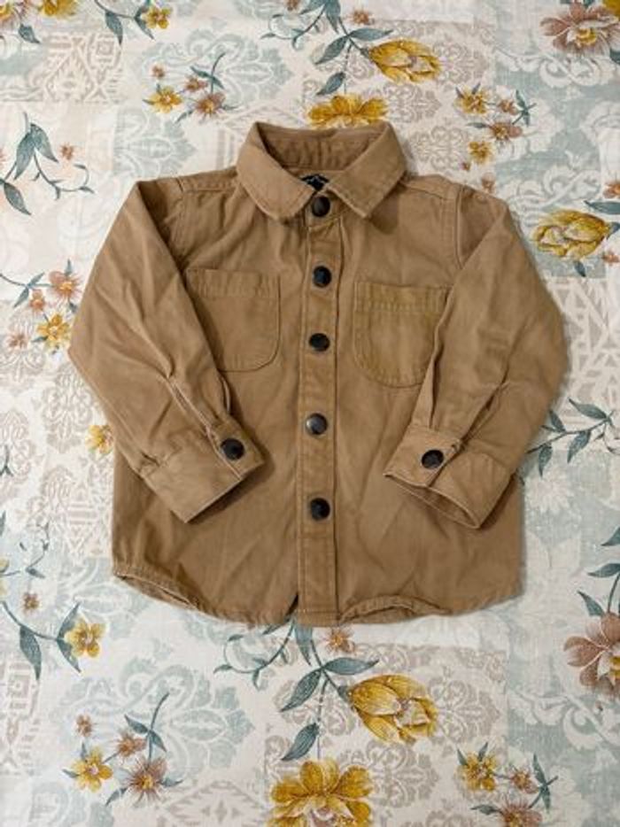 Veste en jeans de couleur marron claire, fermeture avec bouton à pression + une pression au bout des manches et 2 petites poches en haut à l’avant