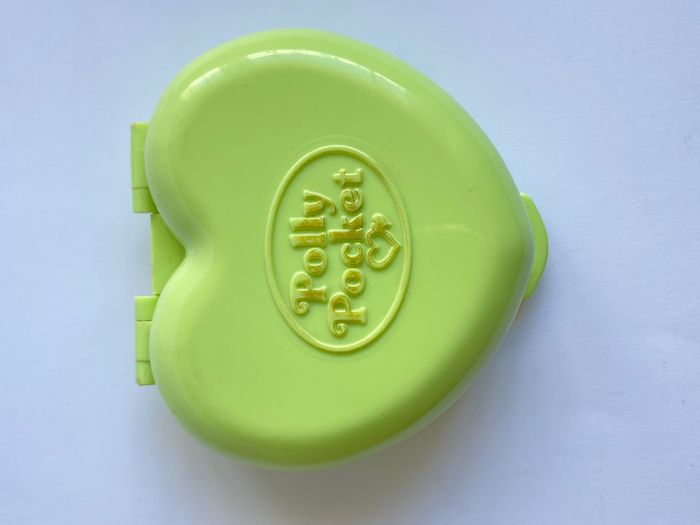 Boîte forme coeur coloris vert. Complet avec ses 2 personnages : 1 Polly et un poney avec un enfant sur le dos. La porte d'entrée et des écuries s'ouvrent. En très bon état, pas de fissures ni décoloration