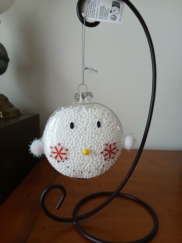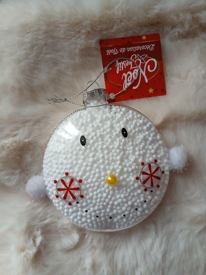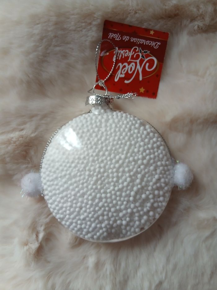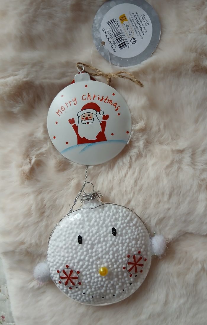 Articles neufs; encore étiquetés. 1/ Boule "Bonhomme de neige " en plastique transparent rempli de billes de polystyrène; petits pompons en guise de bras; lien de suspension. Diamètre de 10 cm; hauteur maxi de 20,5 cm + Boule en métal peint; motif "Père-Noël "; ficelle de suspension. Diamètre de 8 cm, hauteur maxi de 9 cm // voir photos pour détails