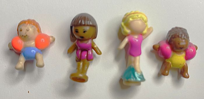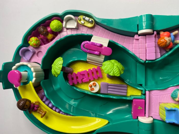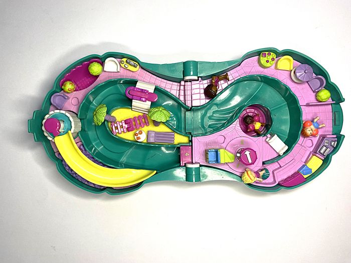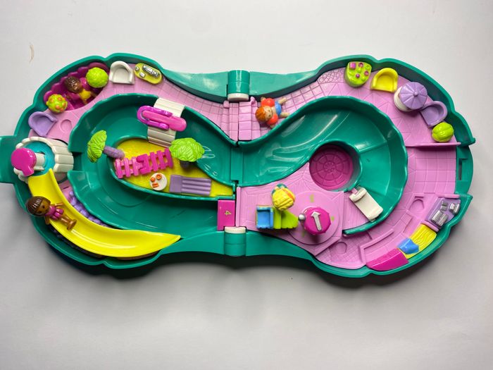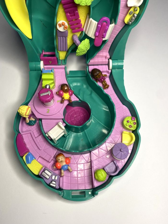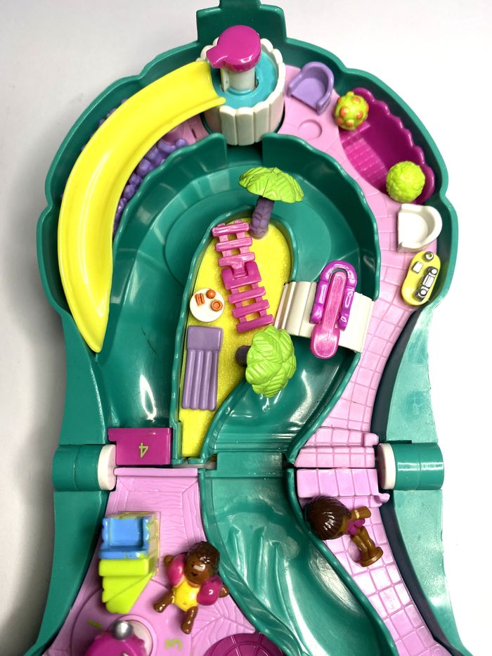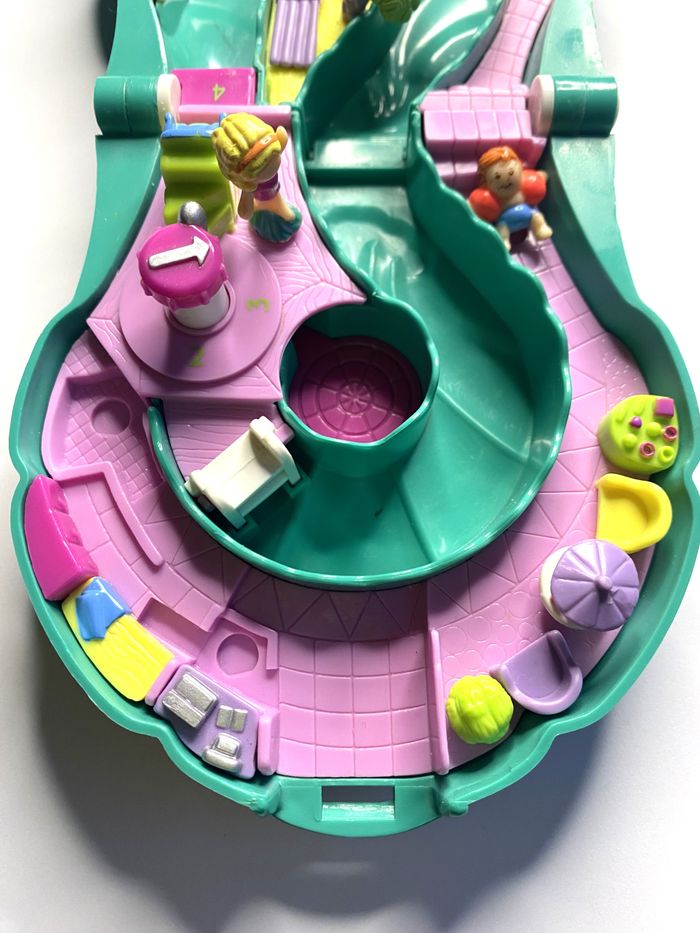 Polly Pocket parc aquatique Splash 'n Slide 1995. Complet avec 4 Personnages : 2 Polly et 2 Bébés avec bouée. Parc aquatique avec toboggan, avec des jeux d'eau grâce au deux pompes. Le dossier de la chaise longue se replie, le plongeoir bouge. En très bon état, pas de fissures ni décoloration.
