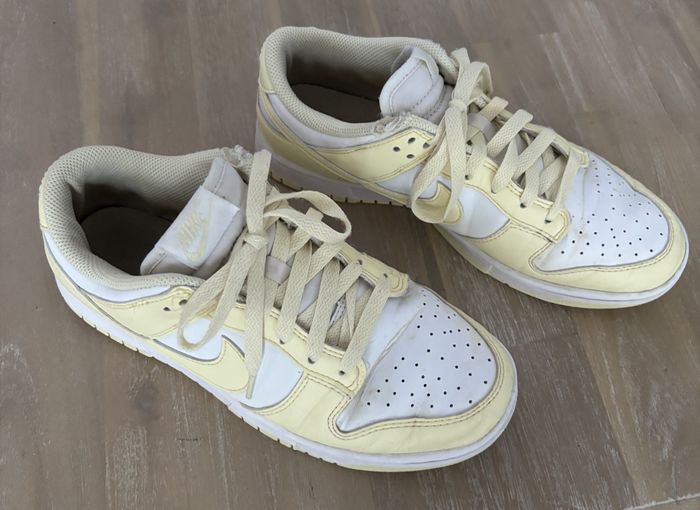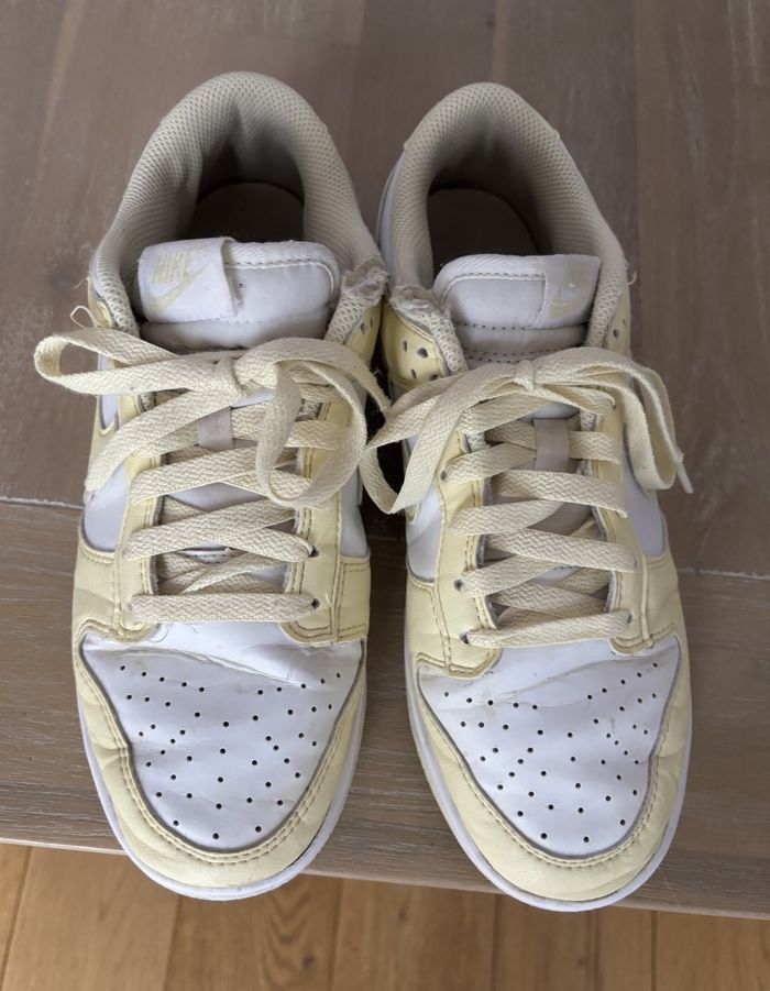 Baskets Nike , modèle dunk. Coloris jaune et blanc. Taille 40. Encore en très bon état, mais usure au niveau du haut sur le tissu.Facile à réparer il suffit juste de faire un petit point de couture pour reprendre les deux morceaux!