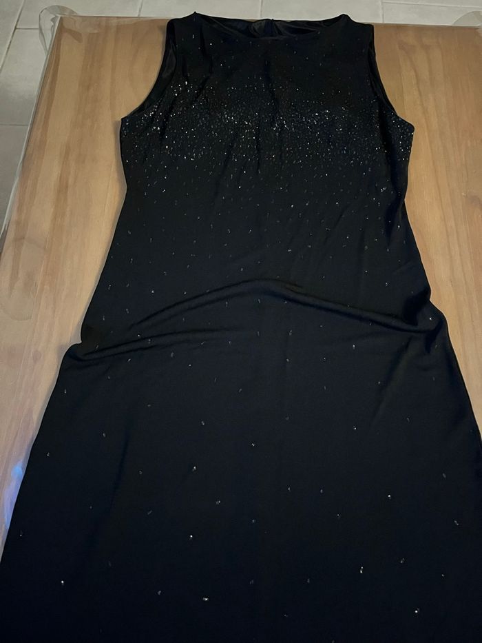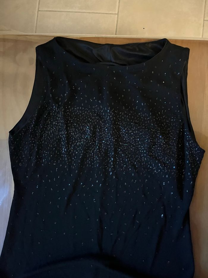 Des brillants sur la robe et des paillettes noires sur la poitrine.
