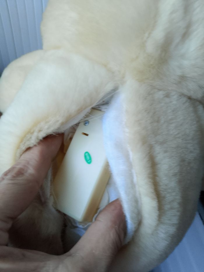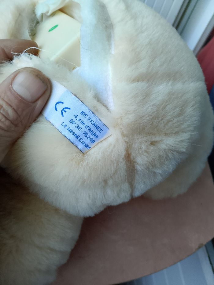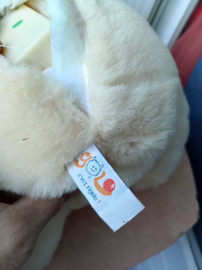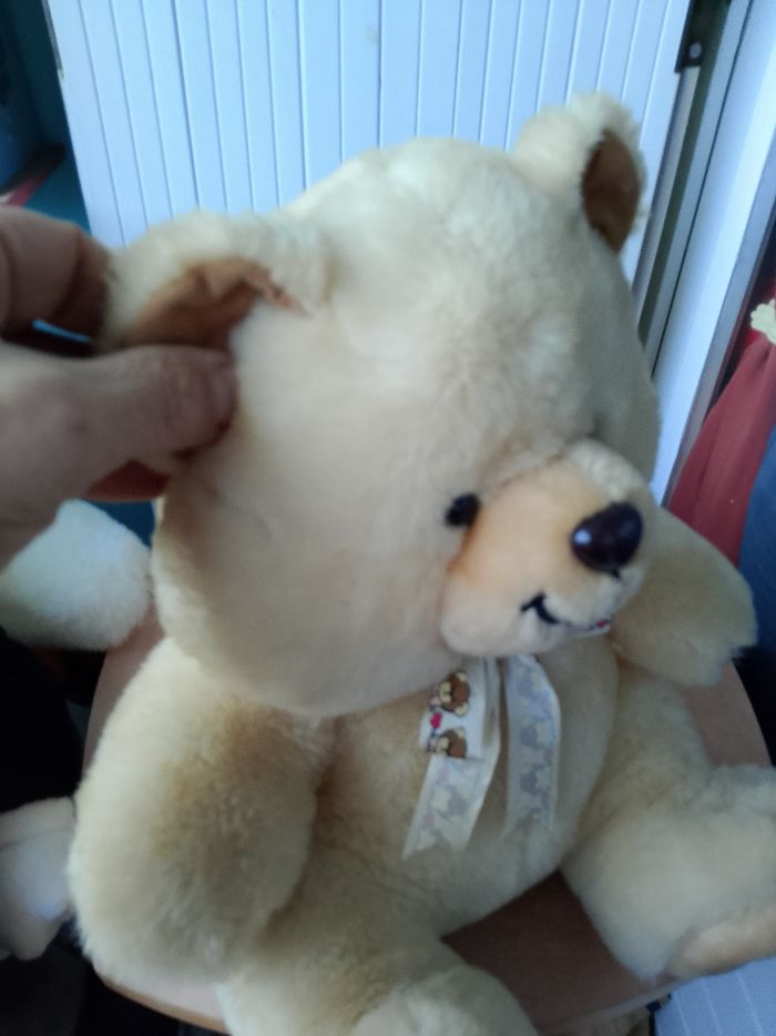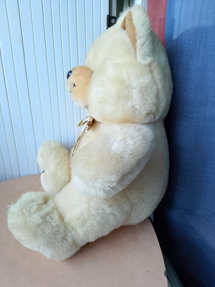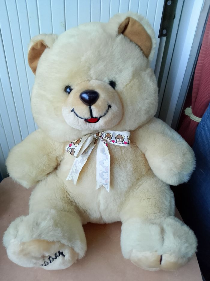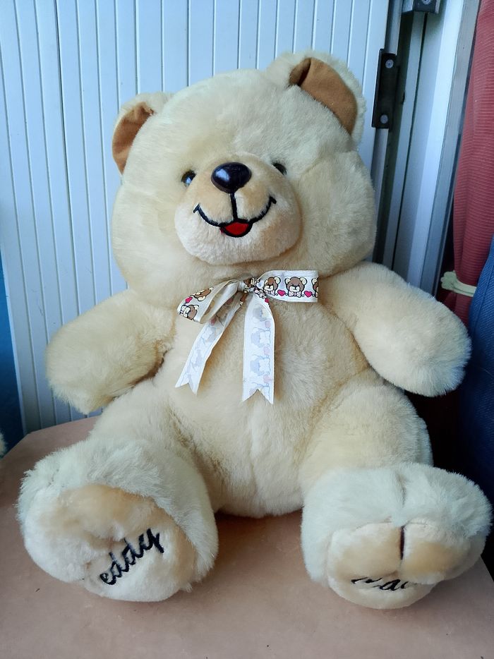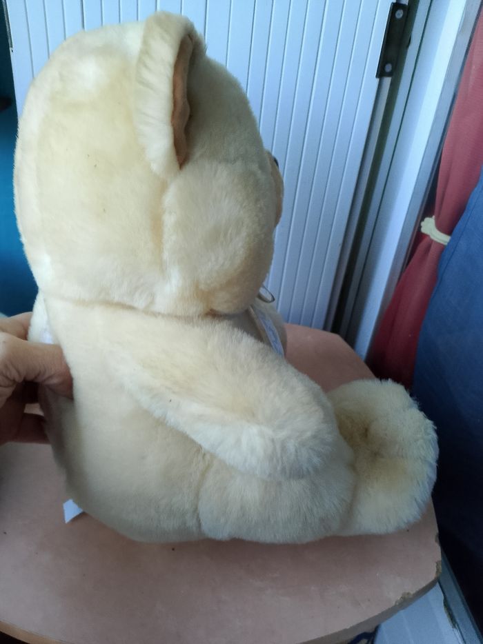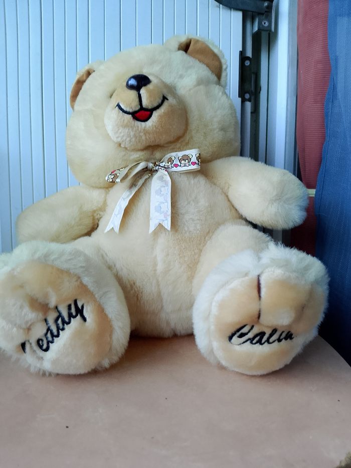 Peluche sonore Teddy Câlin On peut appuyer sur les 2 boutons au niveau des mains, mais il y a aussi 2 boutons au niveau des oreilles et des pieds. Si vous appuyer sur les oreilles, les mains ou les pieds vous aurez une phase différente... Hauteur : 34 cm Neuf