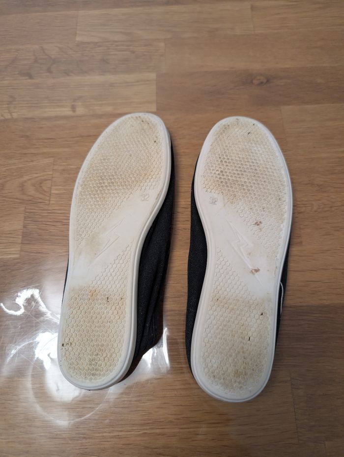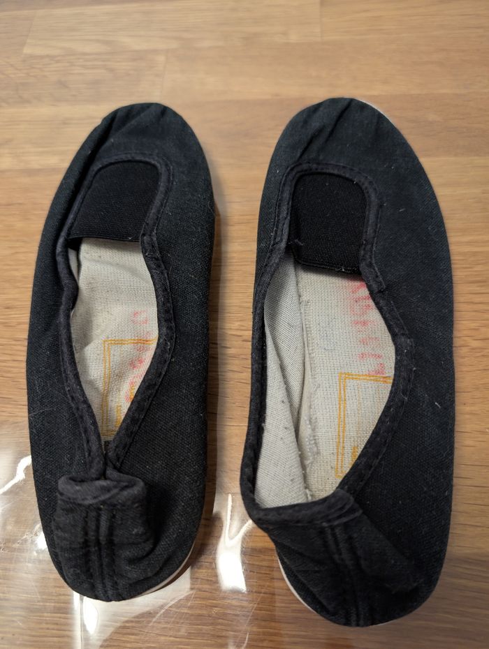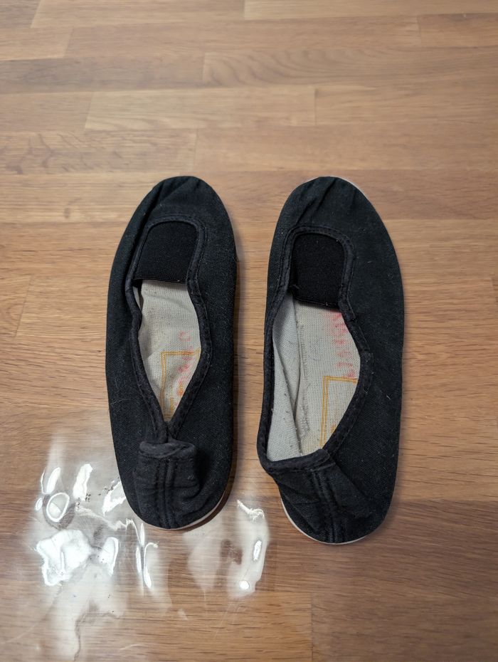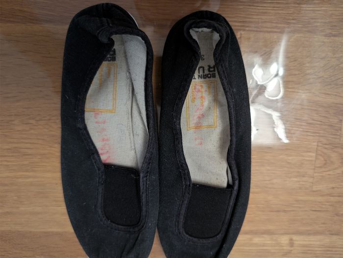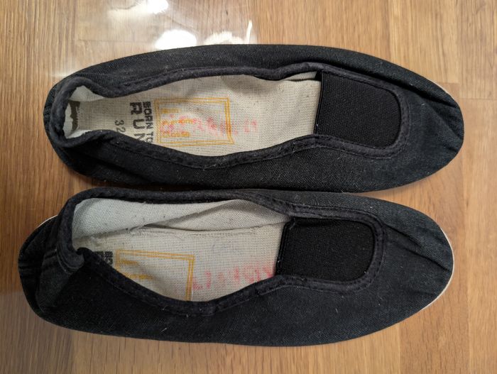 Chaussons de gym unisexe pointure 32 État satisfaisant, noir passé, dessus de semelle intérieure décollés, semelles extérieures sales, les chaussons ont été lavées.