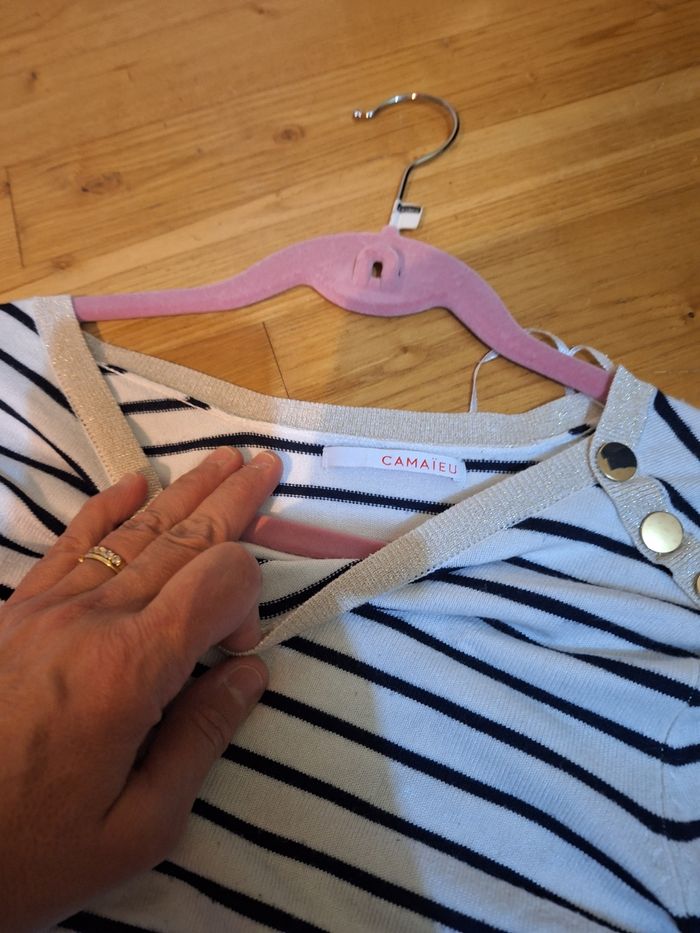 Je vends ce lot comprenant Un cardigan kiabi rouge taille M Un cardigan beige avec broche kaporal Un pull raye camaieu etiquette coupee mais taillait bien M Prix du lot 18 euros