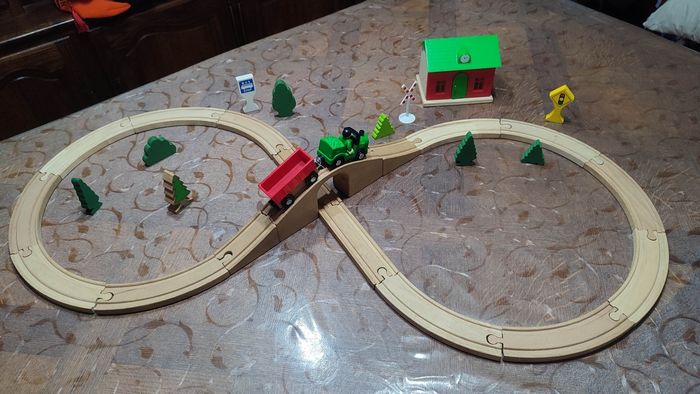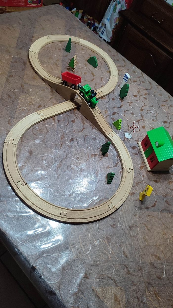 Circuit train vert en bois, forme huit avec accessoires. Bon état. Prix 20€.