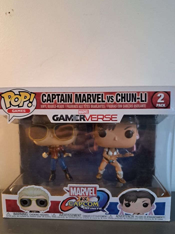 pack de 2 figurines Pop! Marvel vs. Capcom représentant Captain Marvel et Chun-Li, deux personnages emblématiques de l'univers Marvel et de la franchise Street Fighter.