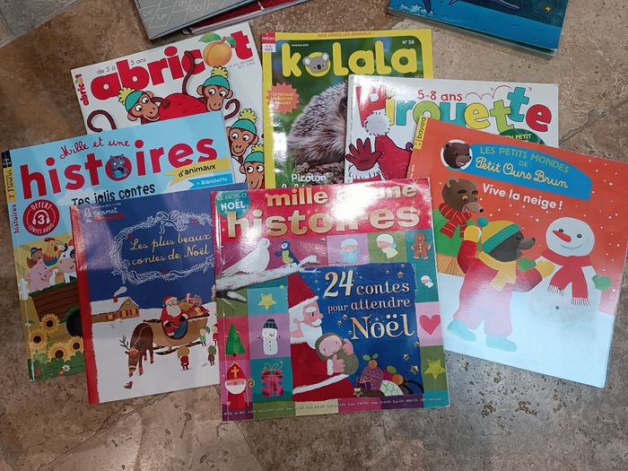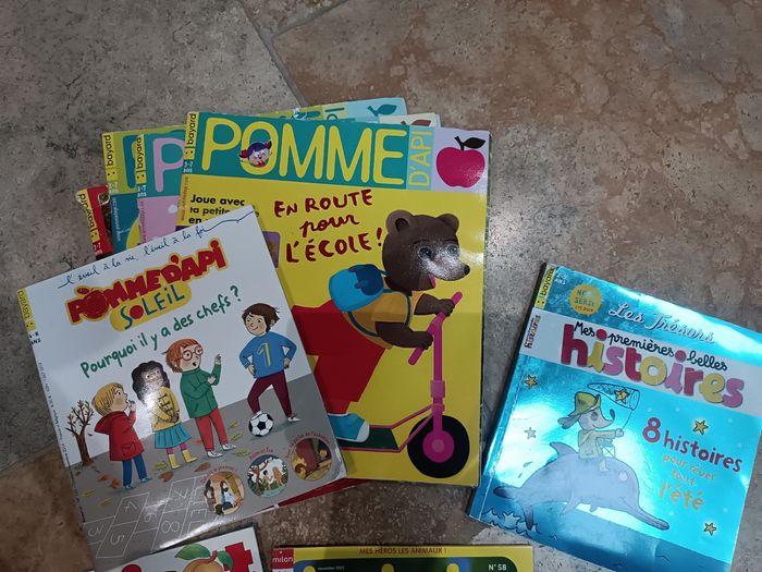 Je vends ce lot de livres pour enfants, comprenant des titres comme Pomme d'Api, Abricot et Petit Ours Brun, Mes premières belles histoires, Kolala, Milles et une histoires, Pirouette....