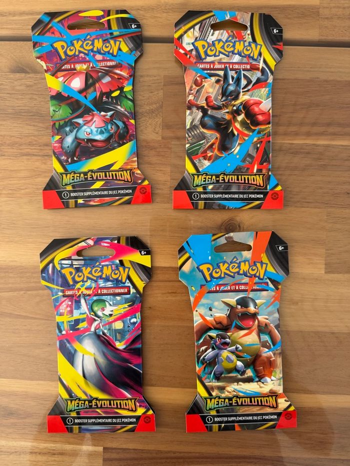 🔹 Arset de Boosters sous blister cartonnés Méga Évolution : Lucario / Gardevoir / Florizarre / Kangourex