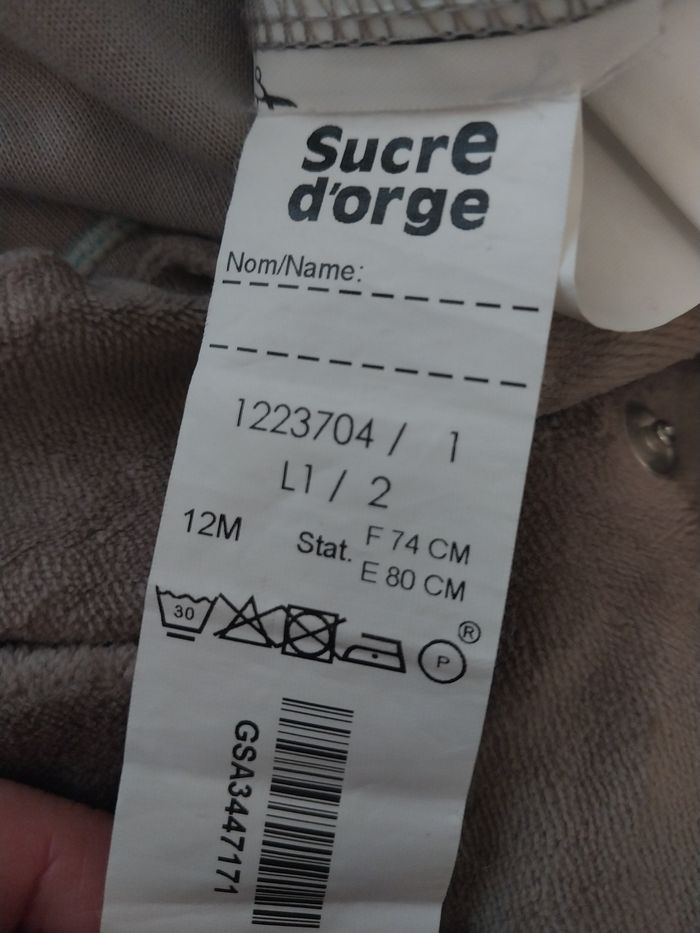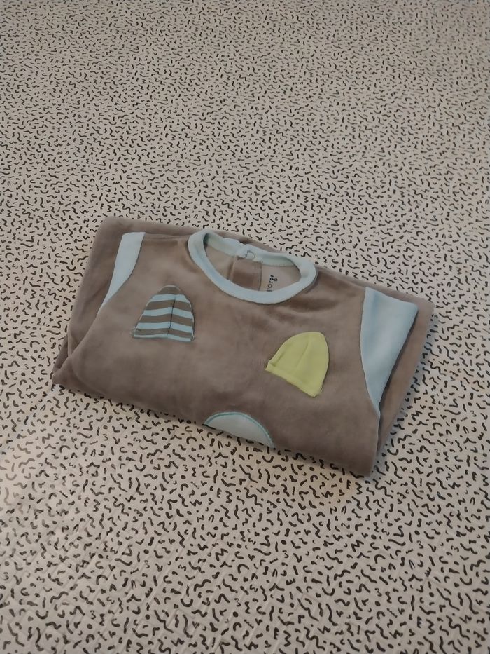 Adorable pyjama Sucre d’Orge en velours ultra doux, taille 12 mois. Modèle mixte, dans des tons gris et bleu clair, avec un joli ourson en relief sur le devant (oreilles et détails appliqués). Fermeture pressionnée dans le dos : habillage rapide, idéal pour bébé. ✔️ Composition 75 % coton 25 % polyester → Doux, chaud et respirant. ✔️ Détails Pieds intégrés Col rond doux Marque brodée sur la manche Motif ourson adorable Taille : 12M (74–80 cm) ✔️ État Très bon état, pas de défaut notable. #SucreDOrge #Pyjama12M #PyjamaBébé #PyjamaVelours #VêtementsBébé