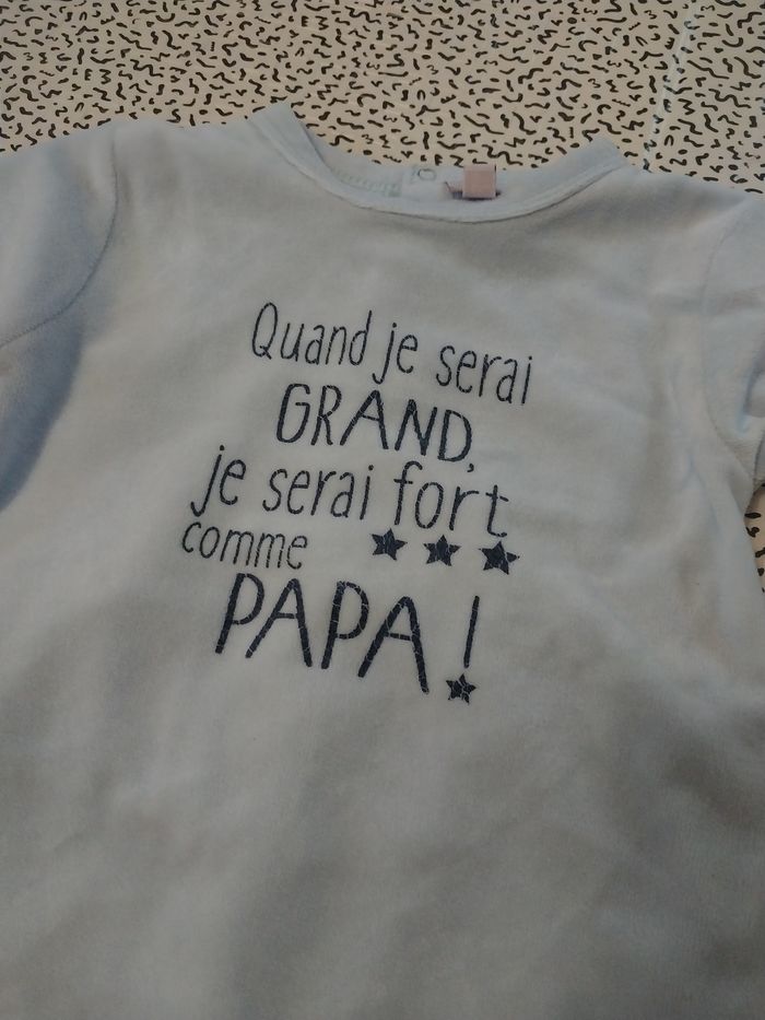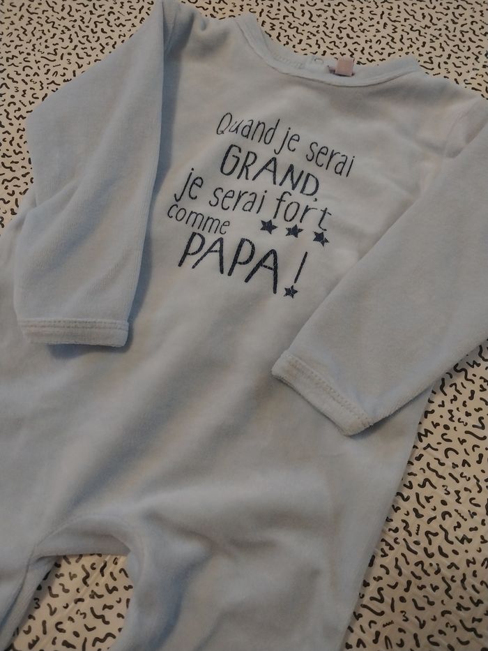 Adorable pyjama Pommette en 12 mois (74 cm), en très bon état. Matière douce et chaude en velours, parfait pour la nuit ou les siestes. Ouverture pressionnée dans le dos pour un habillage facile. Couleur bleu clair avec inscription adorable : “Quand je serai GRAND, je serai fort comme PAPA !” ✔️ État : Très bon Aucune tache, aucune usure. ✔️ Caractéristiques Taille : 12 mois / 74 cm Marque : Pommette Matière : velours tout doux Couleur : bleu pastel Pieds intégrés Boutons-pression au dos #bébé #pyjamabébé #pommette #12mois #74cm
