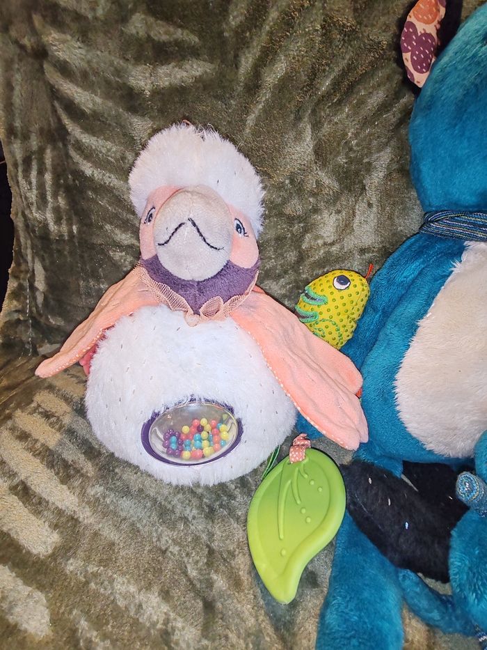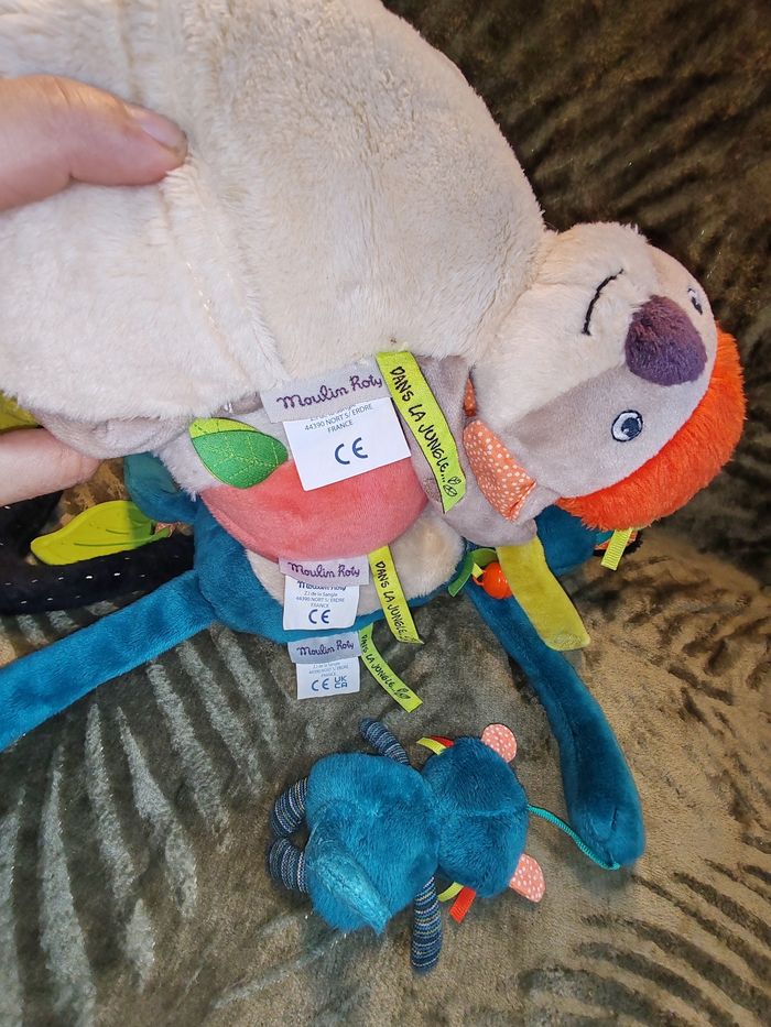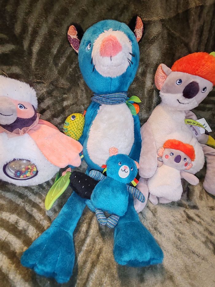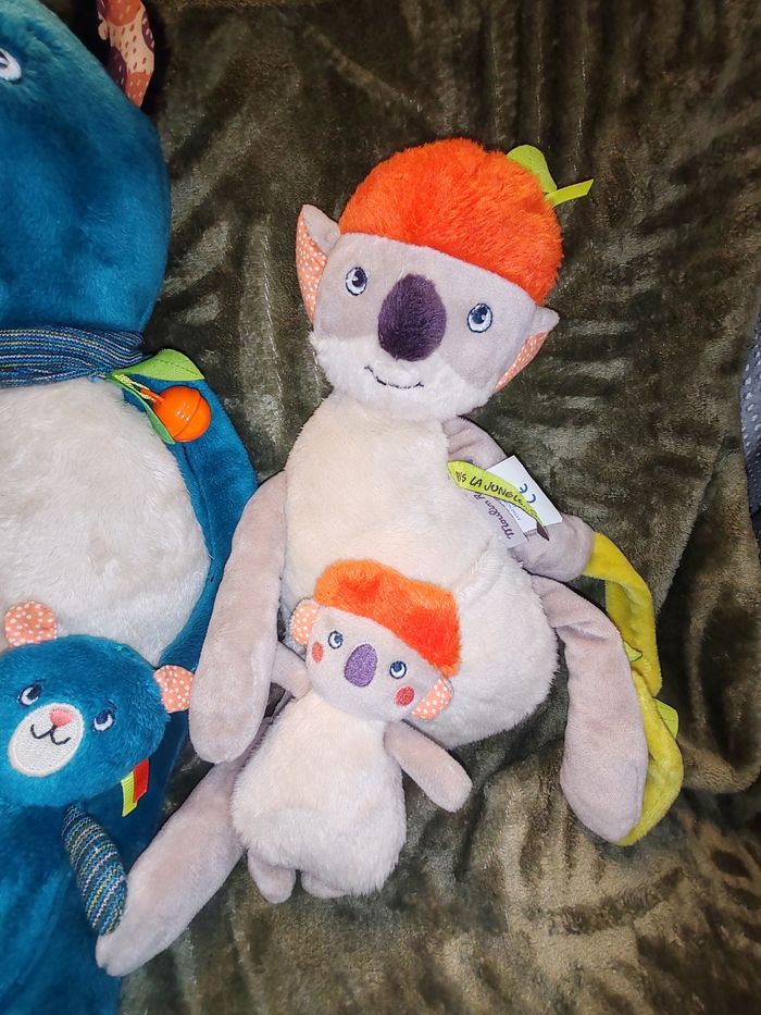 Magnifique lot de peluches de marque moulin rity Collection dans la jungle Le lot comprends La Panthère Zimba et son bébé Doudou peluche Koala d’activités Avec son bébé dans sa poche Et sa boîte à musique qui fonctionne parfaitement Paloma le bel oiseau boule d activité Ils sont en excellent état juste mis en décoration il y a les 4 Étiquette de soie l étiquette de la marque et celle de la collection ! 39.90 euros le lot Envoi en relais