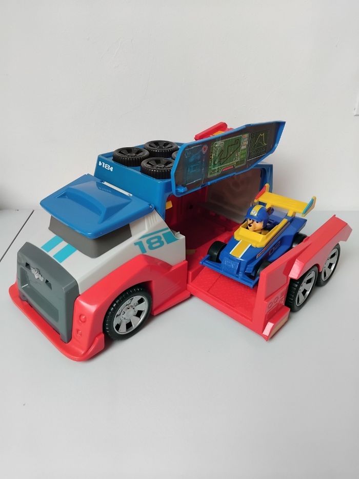 Set Complet, la voiture de Course se range à l'intérieur du Camion et a un système de propulsion, contient également la Figurine de Chase.