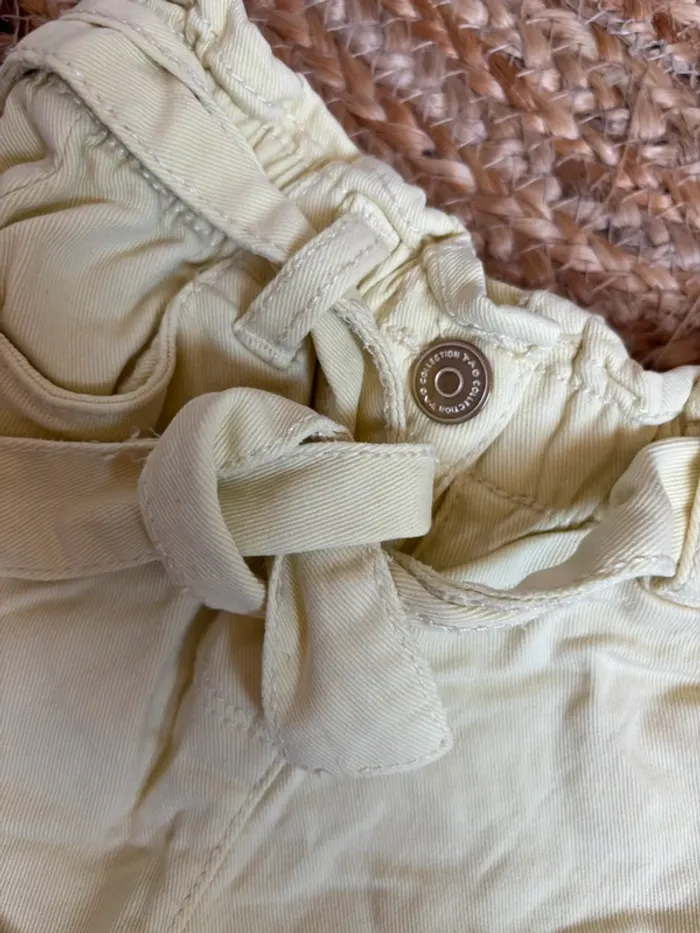 Short en jean jaune clair coupe paperbag + t-shirt blanc imprimé Grain de blé Tbe