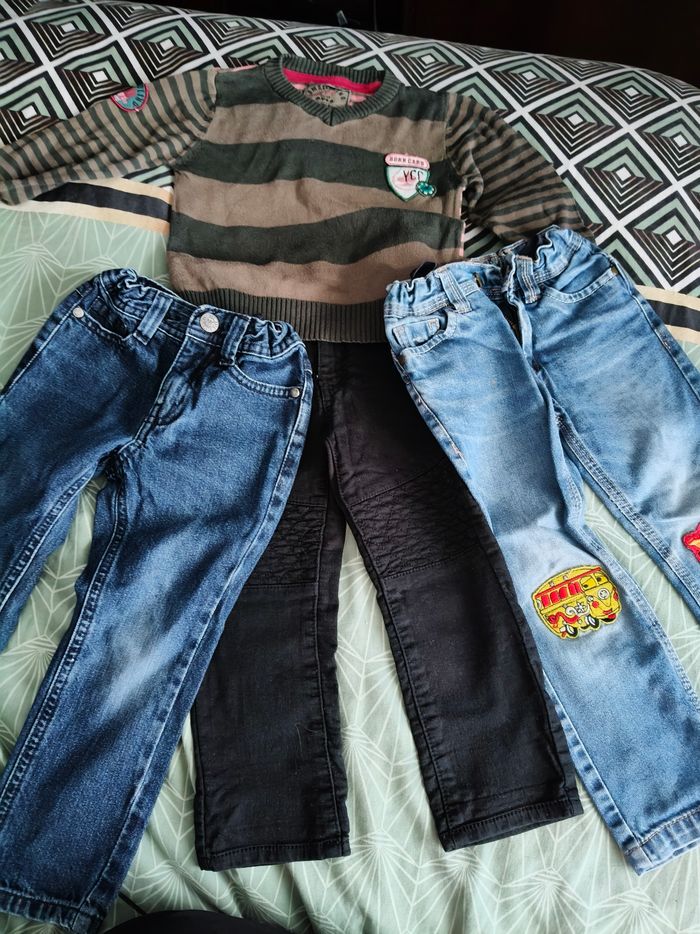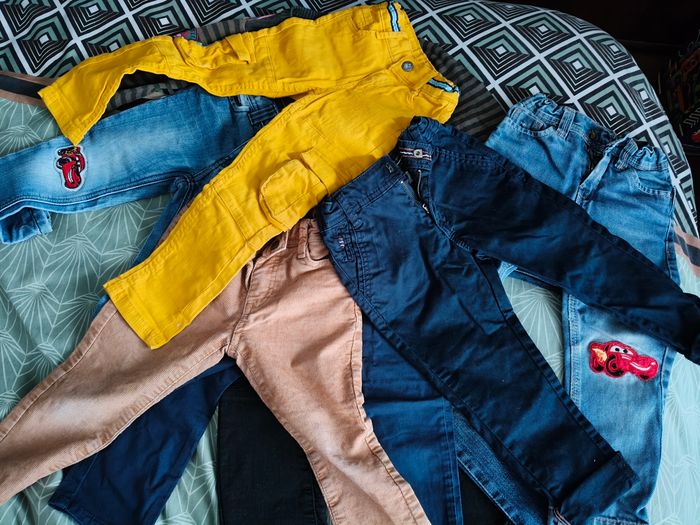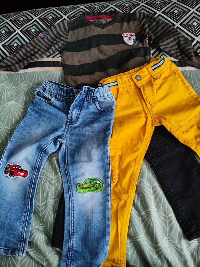 2 jeans bleu Orchestra avec des patchs aux génois Cars dont un un peu ouvert sous voiture verte