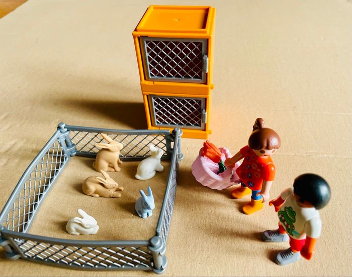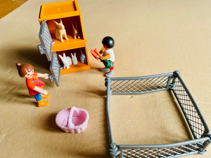 Playmobil C est l heure de nourrir les lapins. Les enfants sont contents de leur donner des carottes Pas de boîte