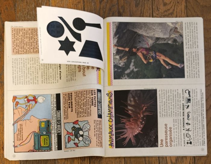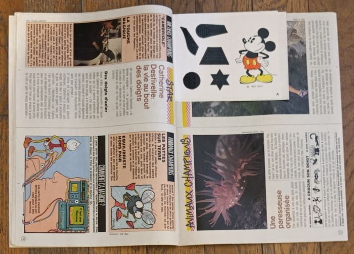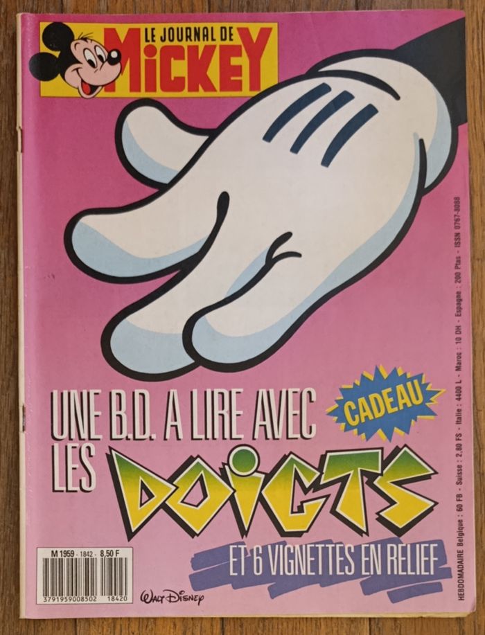 Ancien journal de Mickey N°1842 1987 Avec cadeau vignettes en relief Pour la bd à lire avec les doigts : Les aventures d'Aram et Mara Ce magazine comprend également Mini livre à monter : n°2 le toucher Quelques traces d'usure : - Un peu usé au niveau des agrafes - 3 pages ont les coins cornés mais reste en assez bon état Cf photos Journaux de Mickey avec Bd à lire avec le nez et un autre oeil également disponibles, N'hésitez pas à regarder mes autres annonces Nombreux articles vintage