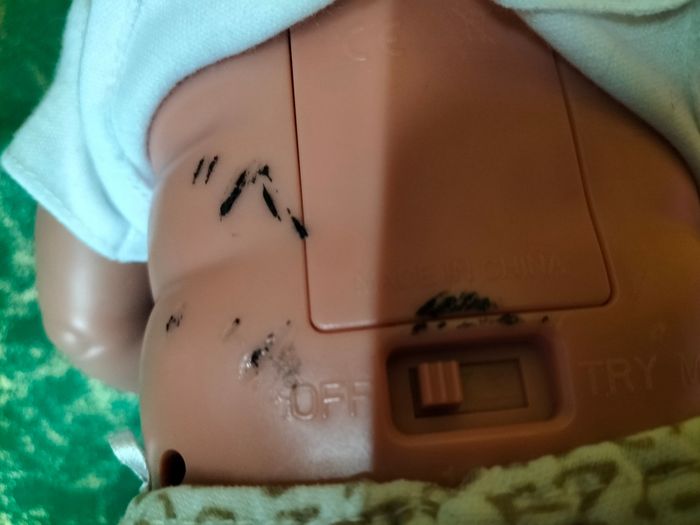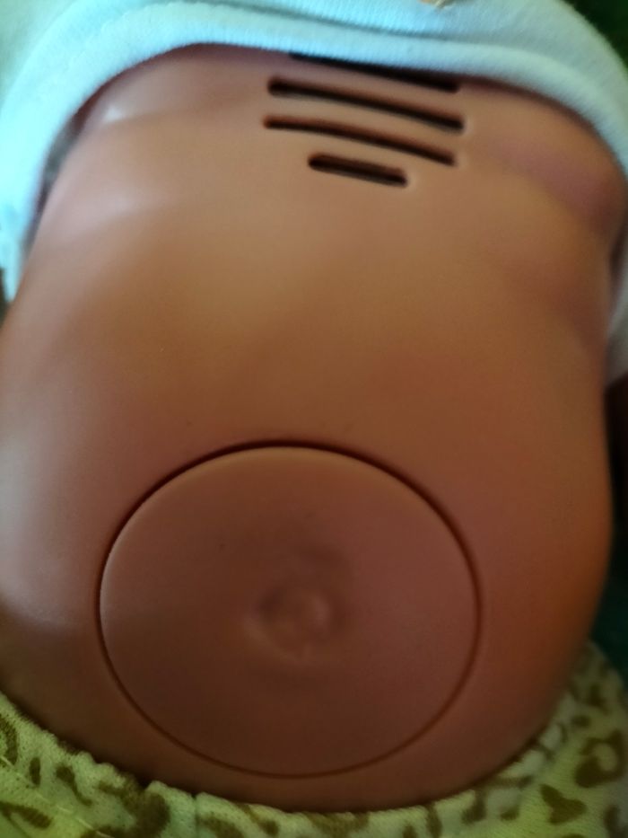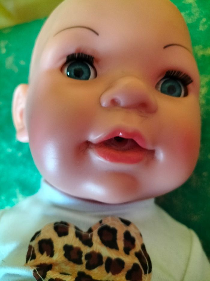 Poupon interactif qui rit, gazouille, tète le biberon, fait des clins d'oeil, et fait pipi après avoir bu le biberon.