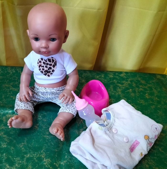 Fourni avec son pot, son biberon, ses vêtements, et je rajoute un pyjama taille naissance.