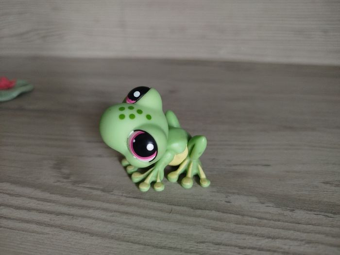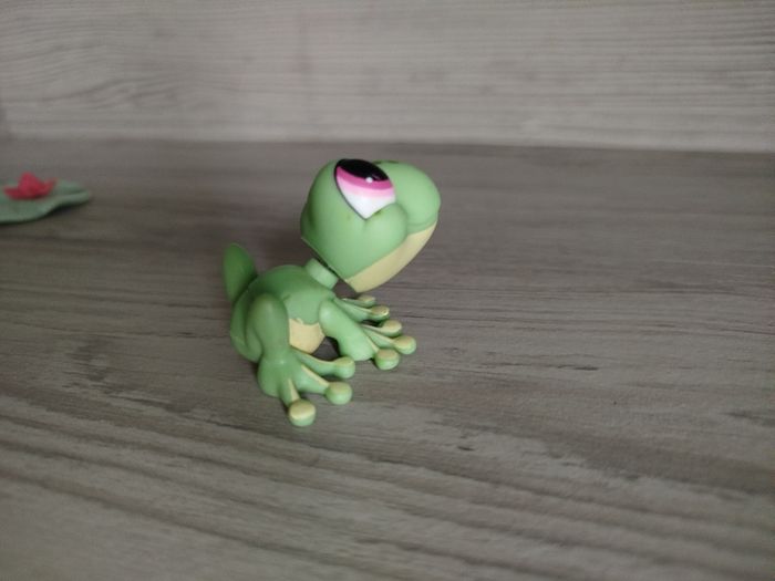 Grenouille verte yeux roses avec feuille et fleur de nénuphar et petit canard, set incomplet, manque couronne.
