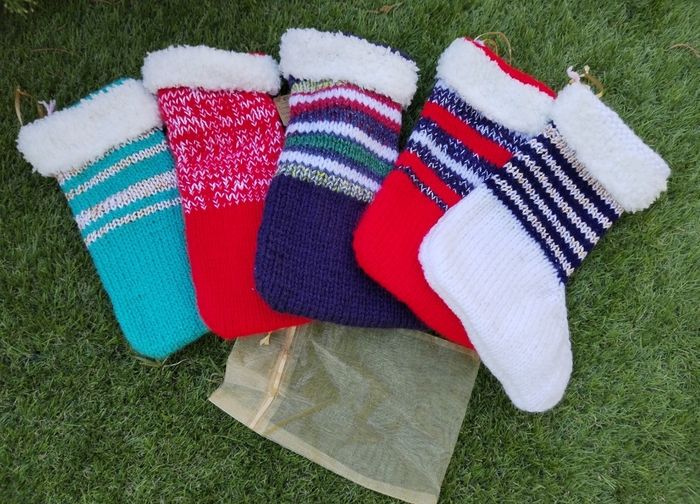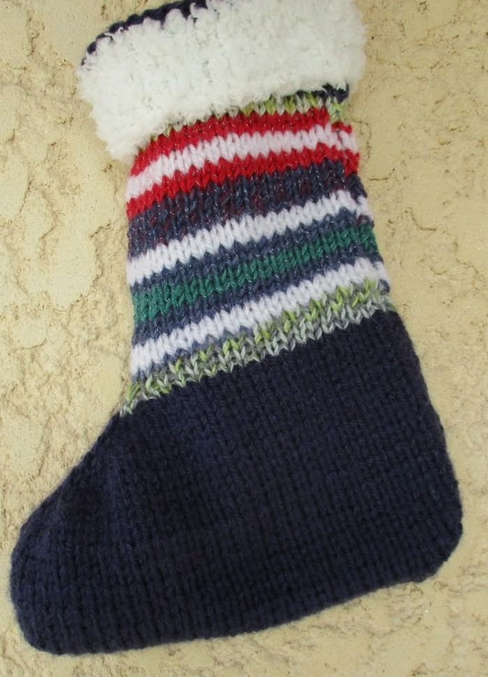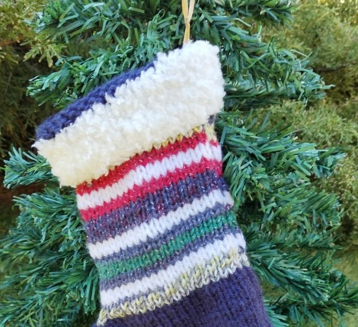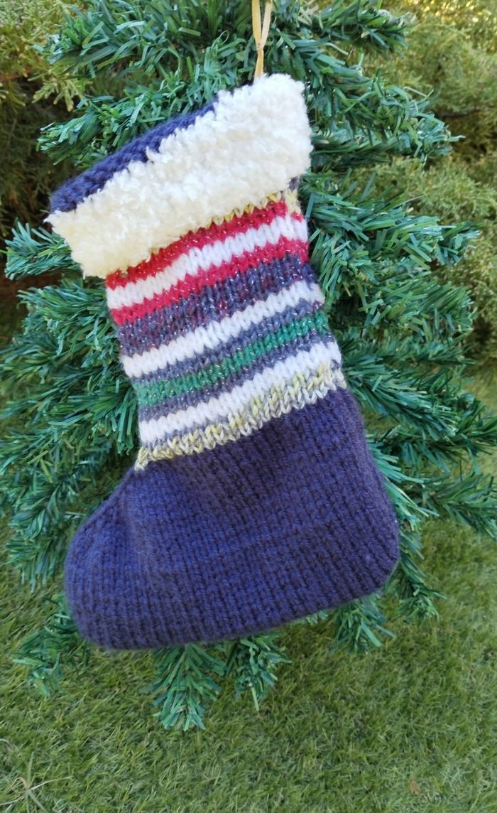Grande Chaussette de Noël, à suspendre 🎄🎅, réalisé au tricot, env 17 x 24 cm, 100 % acrylique, bleu avec rayures rouge blanc et vert, large revers en fil peluche blanc de 4 cm, attache ruban brillant doré, fourni avec un sachet en Organza doré (21 x x 13,5) pour y glisser des petits cadeaux, gourmandises, jouets, maquillage etc 👍 🎄🎅profitez de la réduction sur les lots avec d'autres modèles disponibles 👍 🎄 🎅