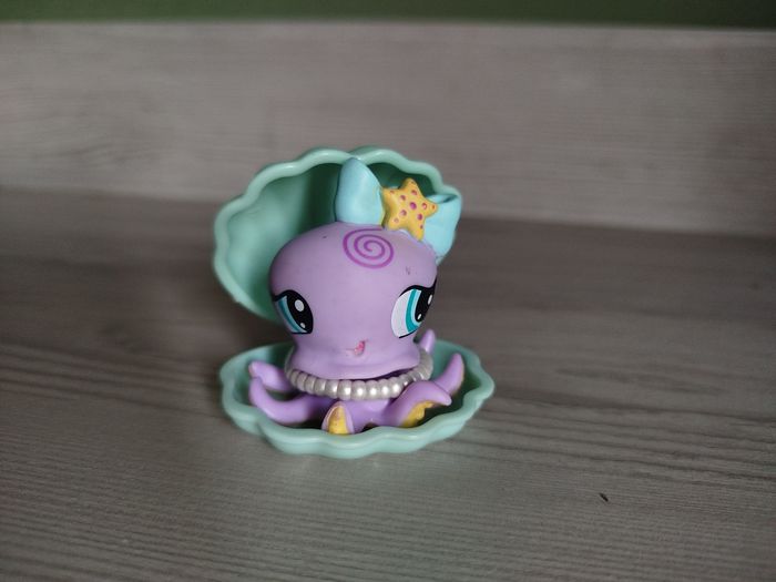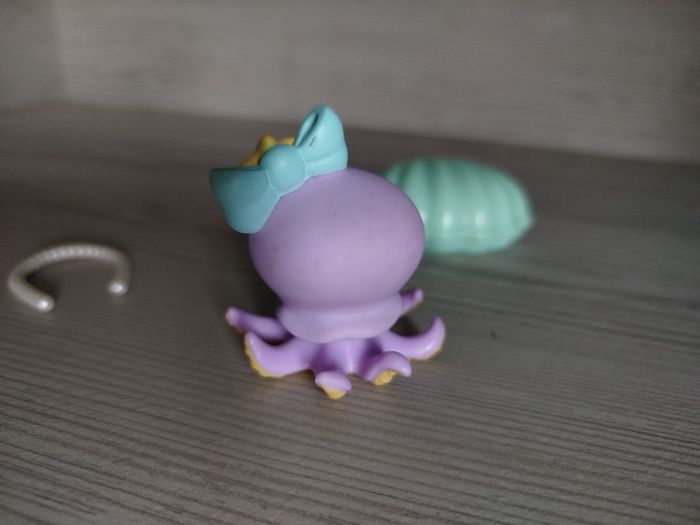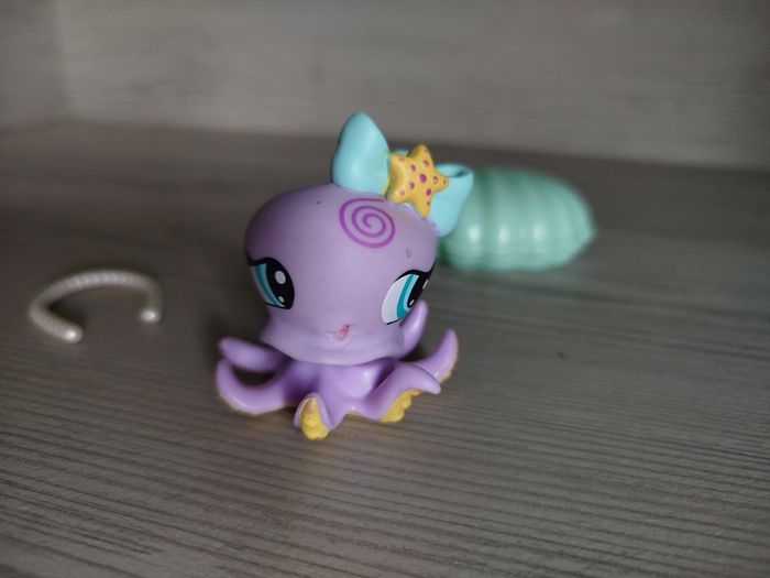 Pieuvre violette à noeud bleu avec coquillage et collier de perles, set complet.
