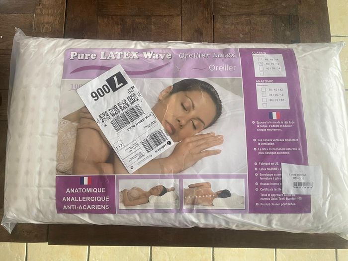 Oreiller 70x40 cm en 100% latex multi-perforé anti-acariens et hypoallergénique neuf, jamais déballé. Prix de vente 49,99€, idée cadeau Noël. Envoi rapide et soigné