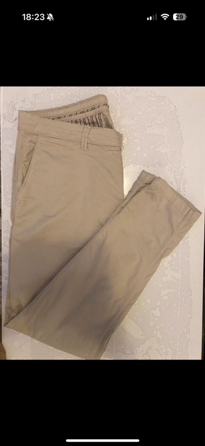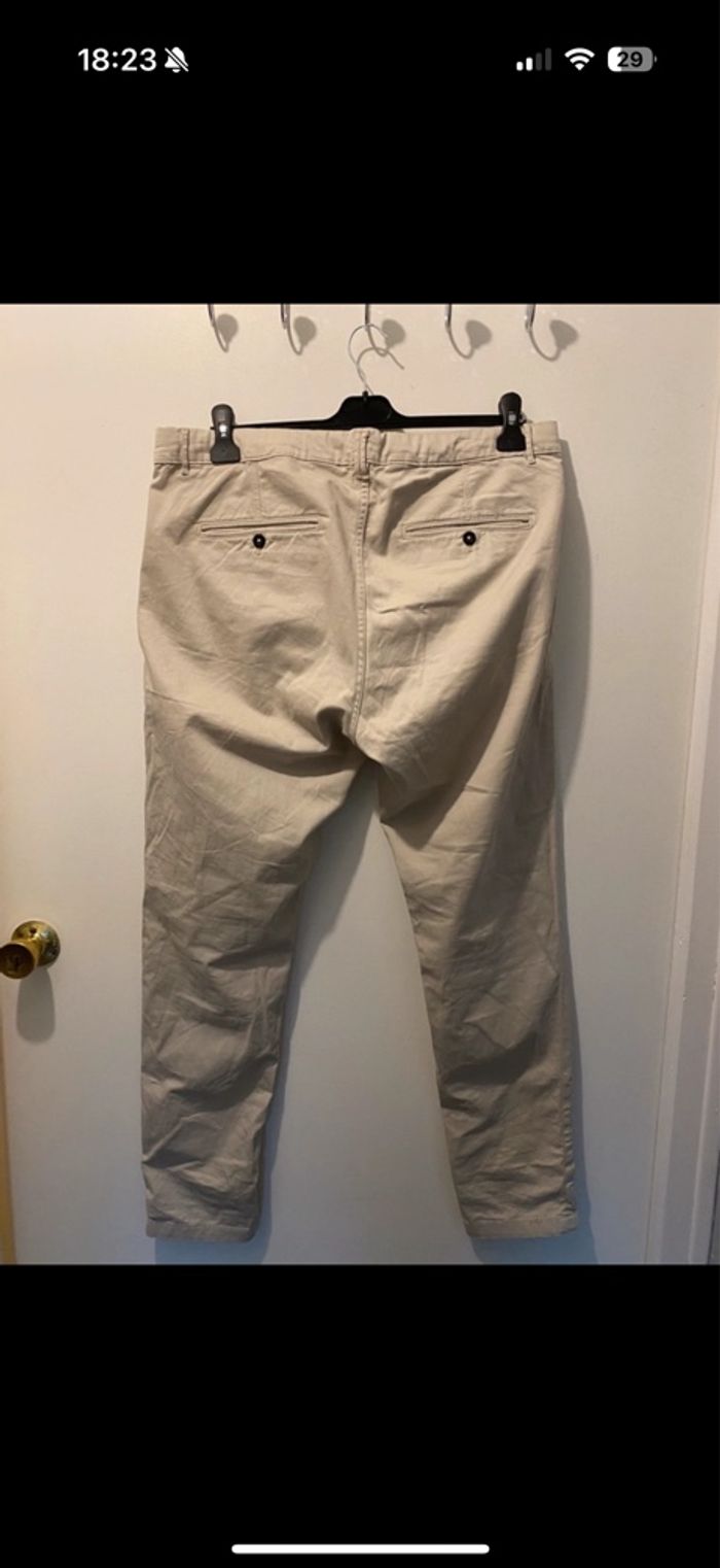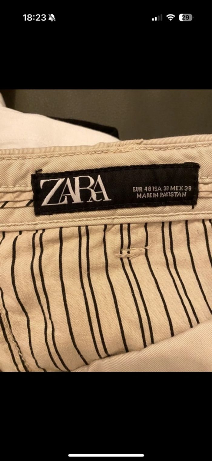 Pantalon homme Zara, Idéale pour un style chic, parfaite aussi bien au bureau qu’en sortie. 📏 Taille : 48 🧶 Matières : 97% Coton ✅ 2 poches arrières et 2 avants latérales 🎨 Couleur : beige / crème 🏷️ Marque : Zara