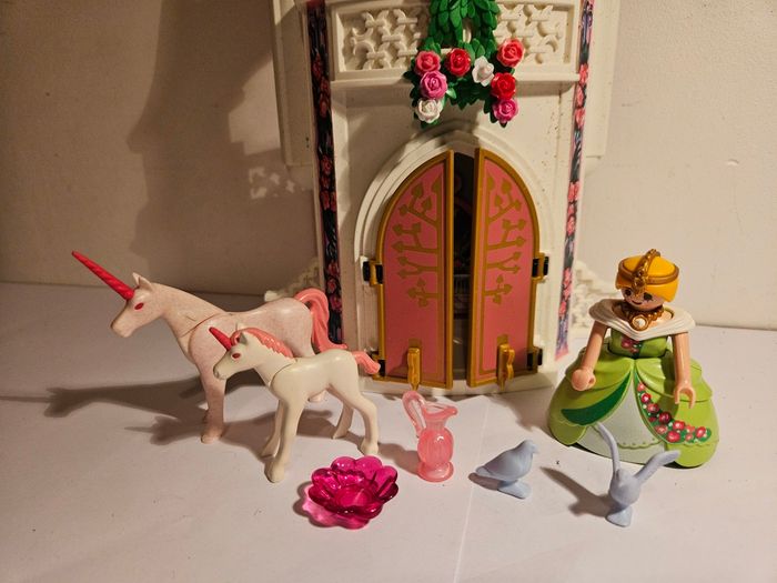 1 Petit château transportable 1 Princesse 2 Licornes 2 Colombes