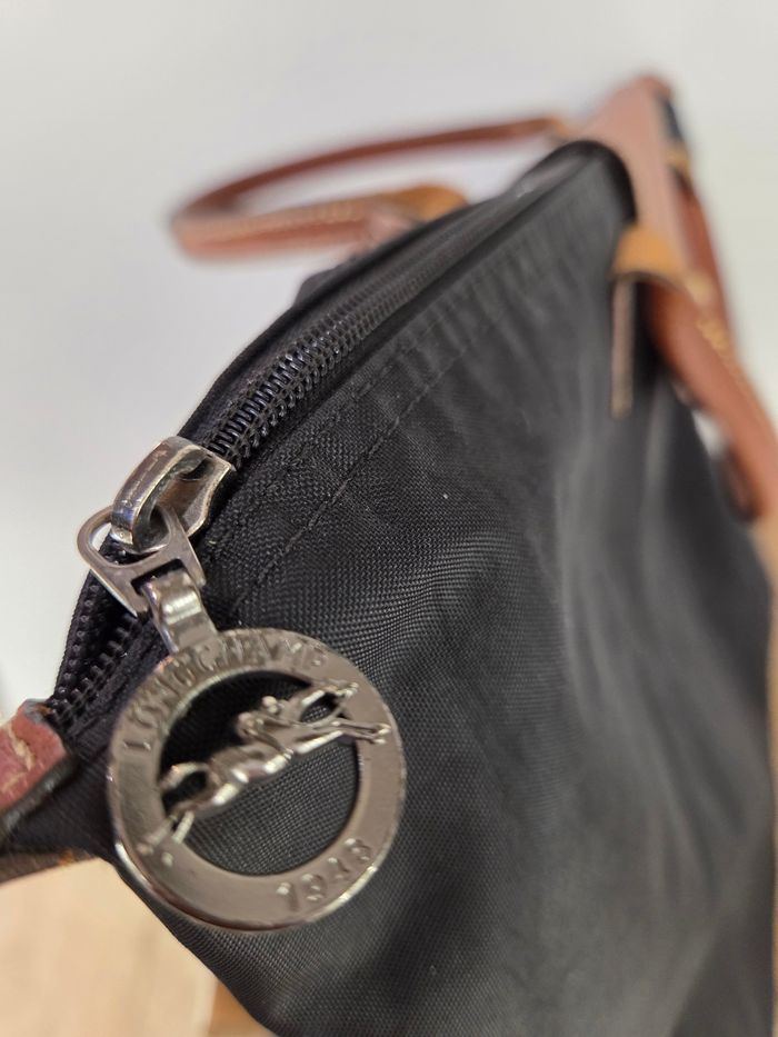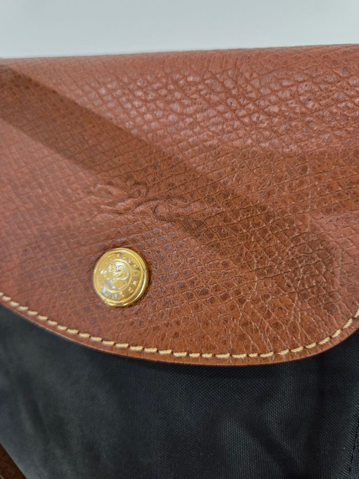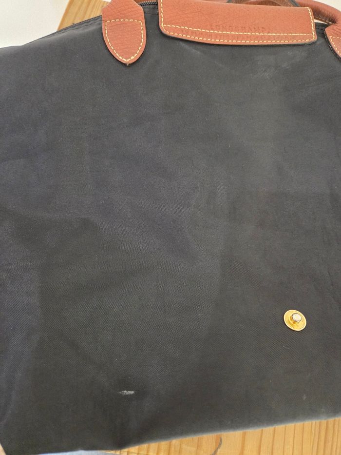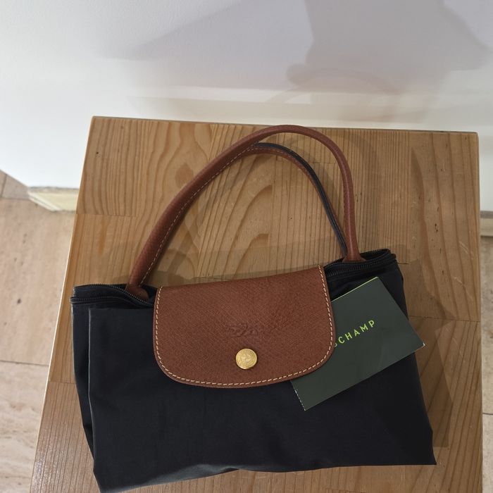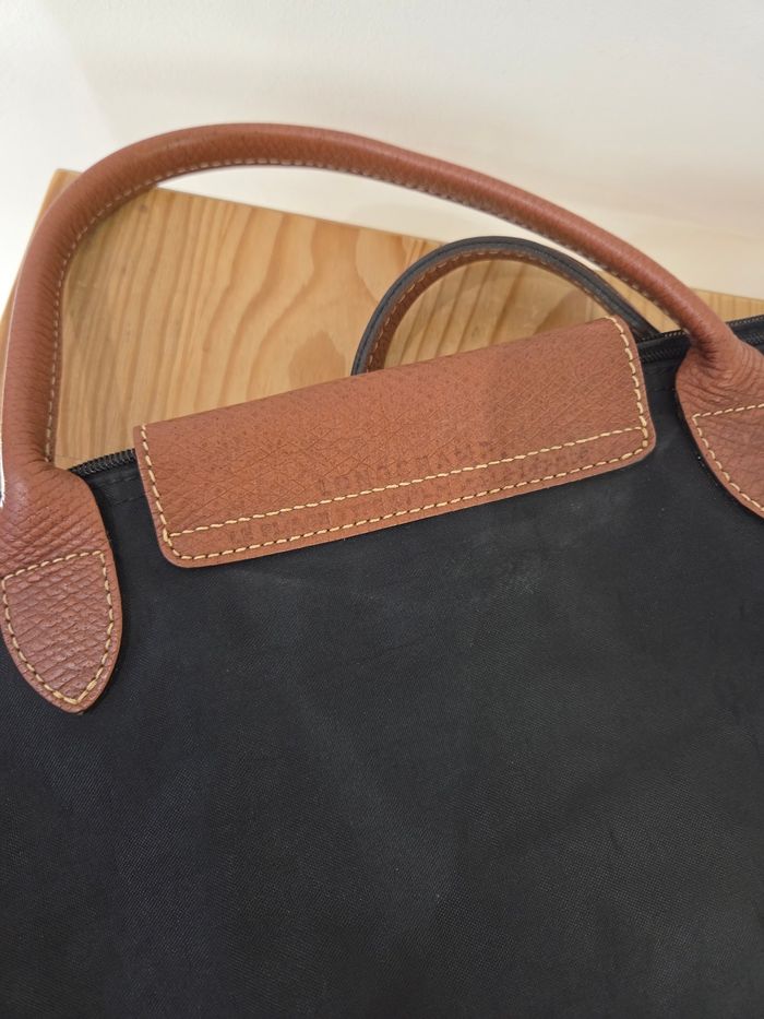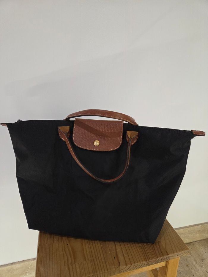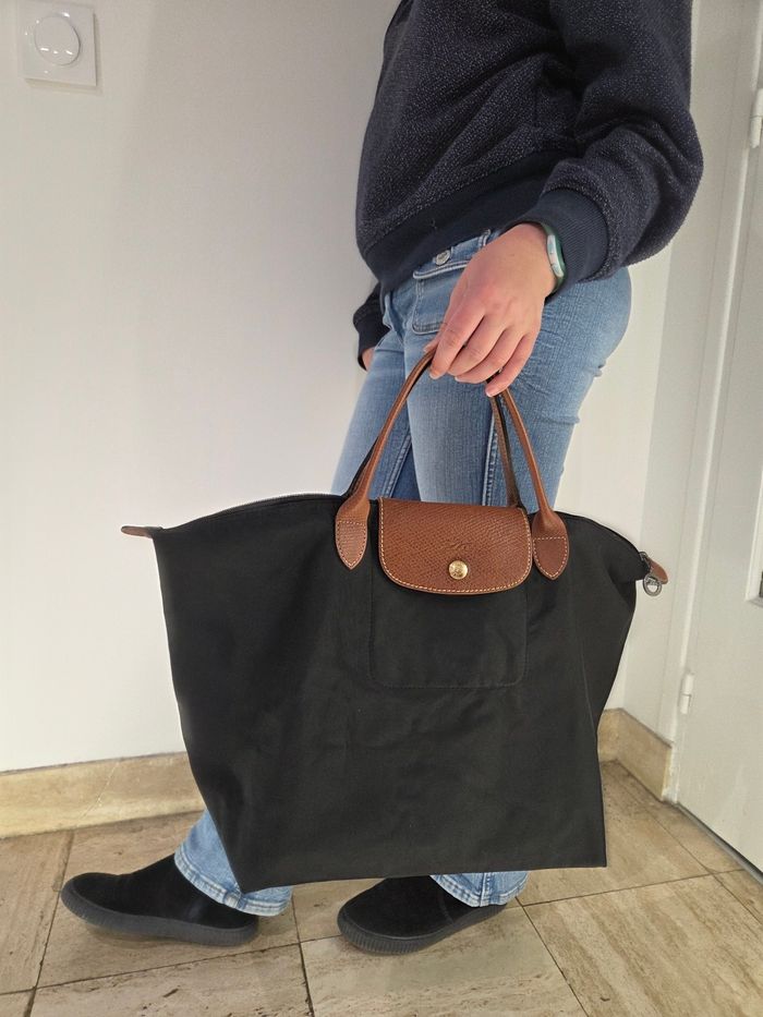 Sac Porté Main Longchamp Pliage - Toile Noire et Cuir Marron Élégant et intemporel sac Longchamp Le Pliage, dans sa version classique et sophistiquée en toile noire avec les détails distinctifs en cuir marron. Ce sac est le compagnon idéal pour le quotidien: il est léger, incroyablement pratique et emblématique de la maroquinerie française. Il se porte élégamment à la main ou au creux du coude. Le sac est en bon état général, mais présente des signes d'usure normale après avoir été porté (voir photos) * Présence de quelques petites traces/ marques d'usure sur la toile noire (principalement aux coins, typique du modèle) ainsi qu'une petite coupure en bas du sac * Le cuir marron des poignées et du rabat montre une patine naturelle et quelques légères marques d'usage. Ce sac est prêt à entamer une seconde vie ! Une pièce chic et indispensable. Largeur 47 cm en haut du sac et 29 cm en bas Hauteur 28 cm Profondeur 20 cm Soit une taille L à l'erreur de mesure près
