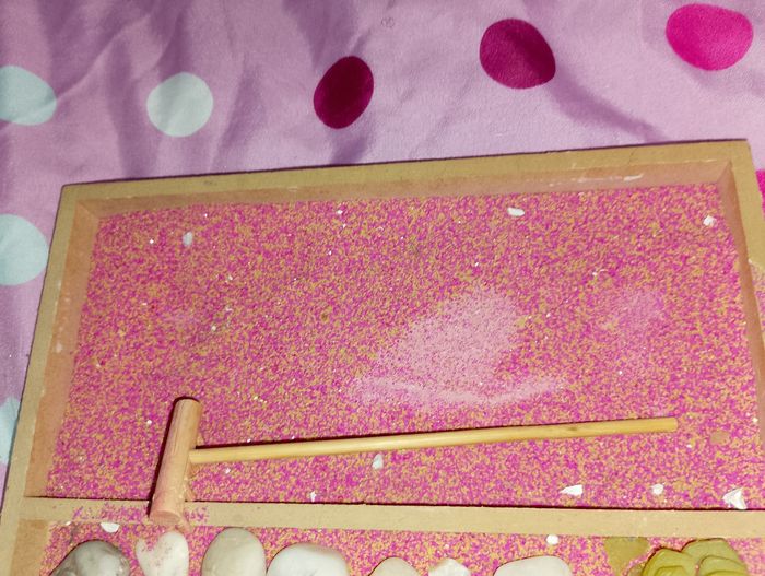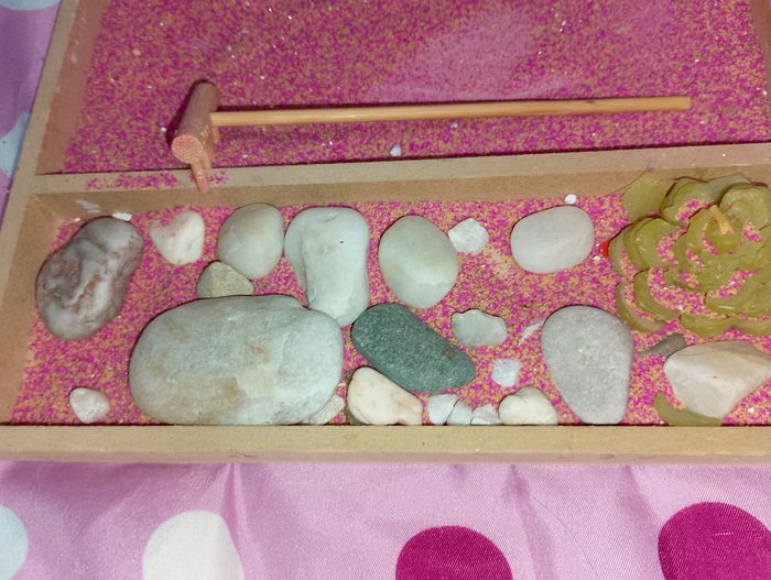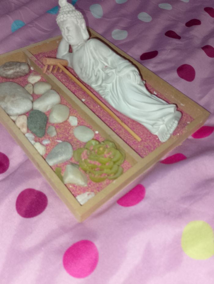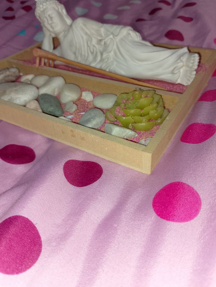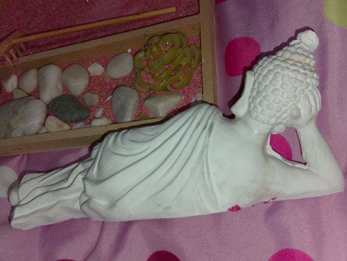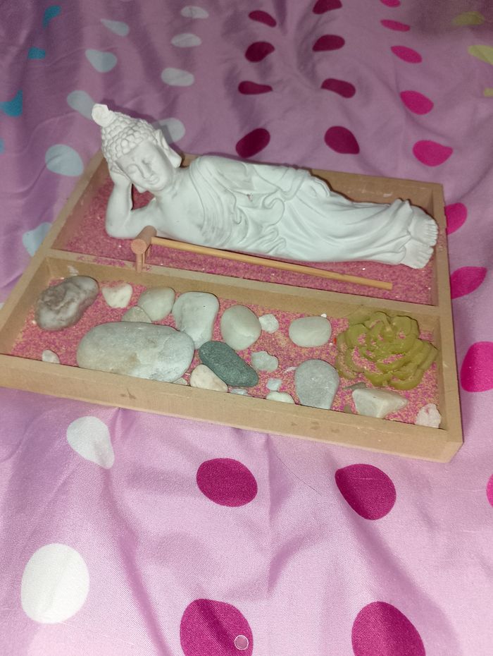 Décoration bouddha allongé Avec son râteau et ses accessoires Vendu en l'état Taille du support 18x22 H.2cm