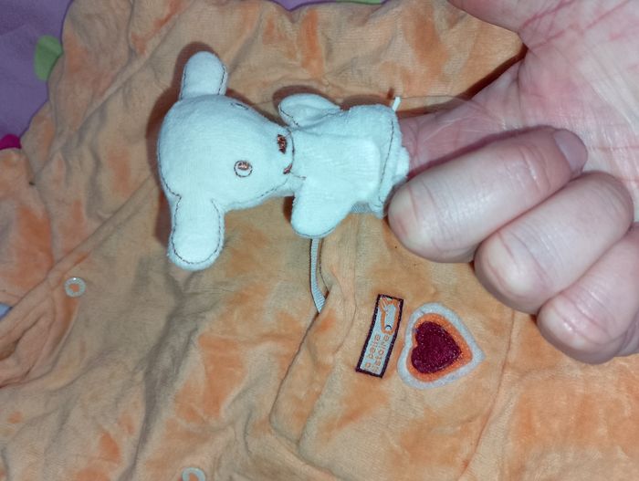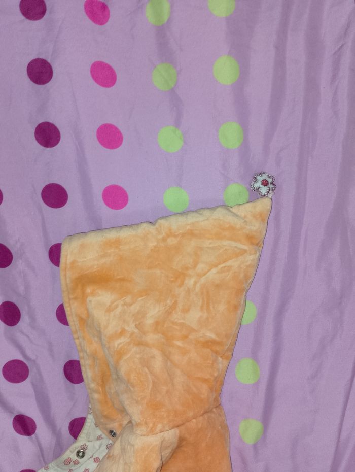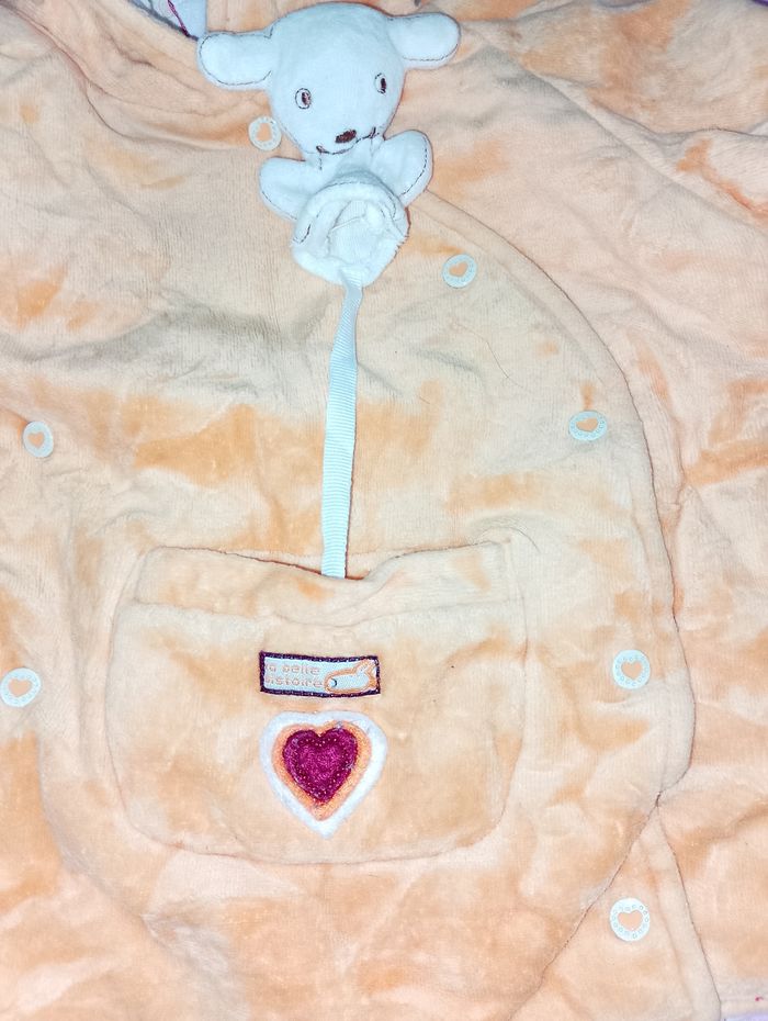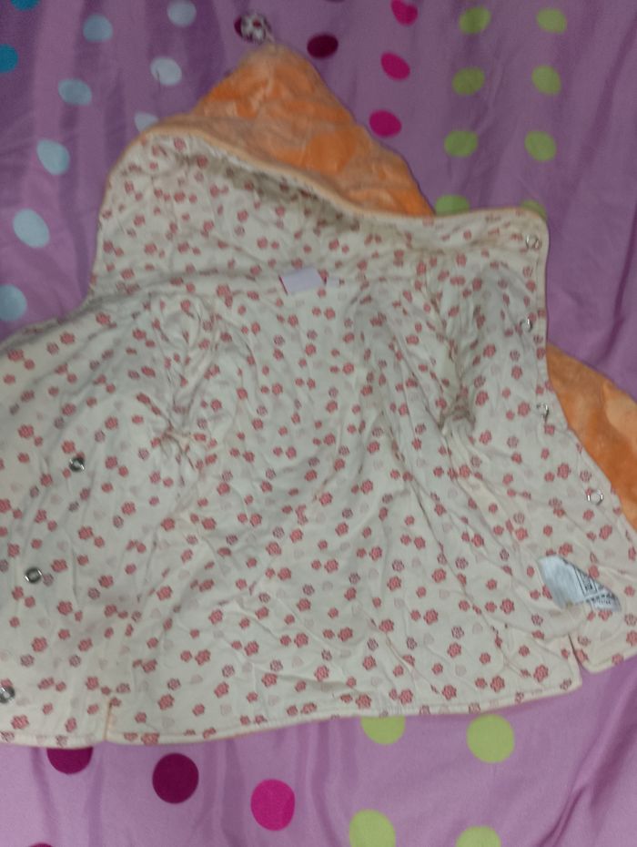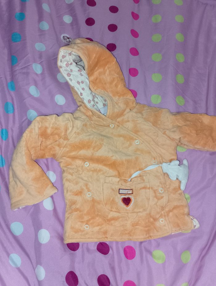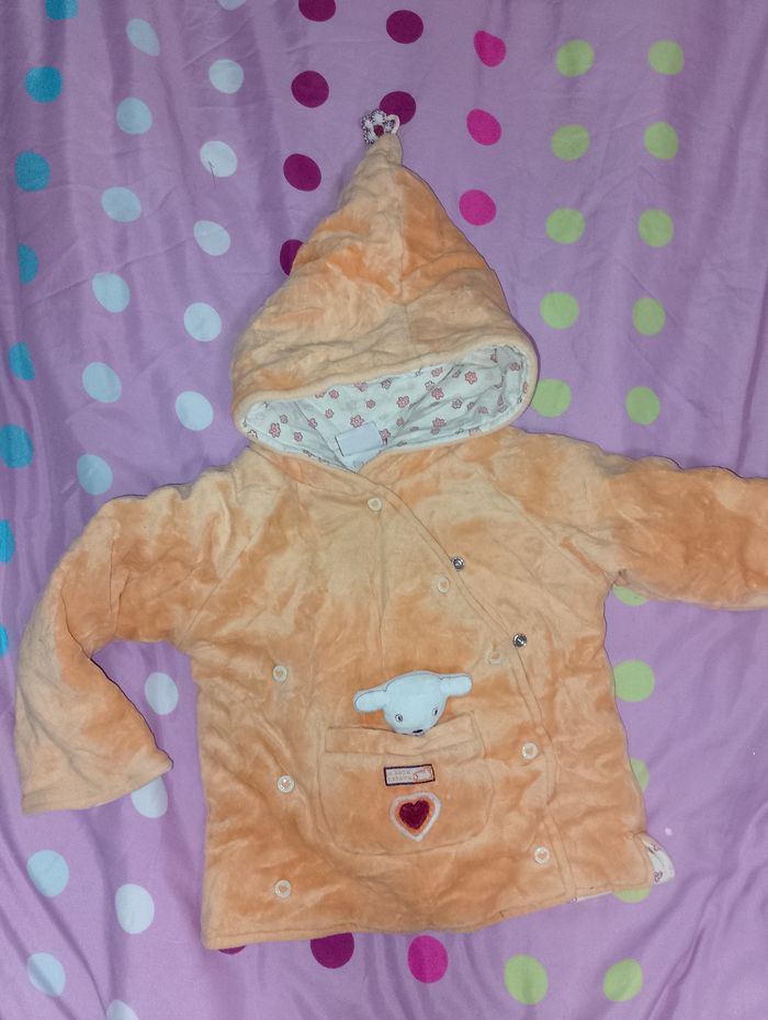 Manteau 6 mois Influx avec 5 pressions avec 1 petite poche sur le devant pour y mettre le petit doudou ( marionnette )qui est accroché dans la poche avec capuche en pointe très chaud