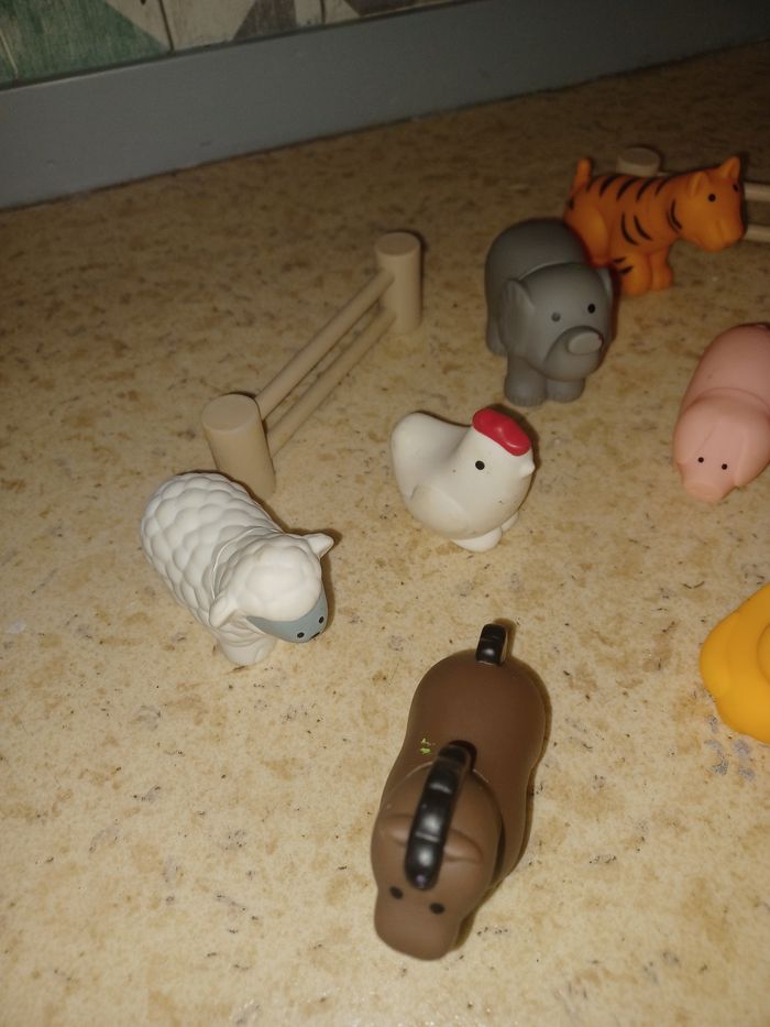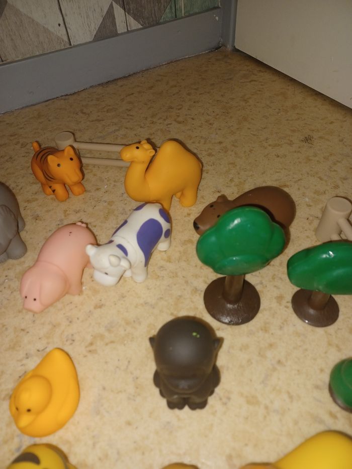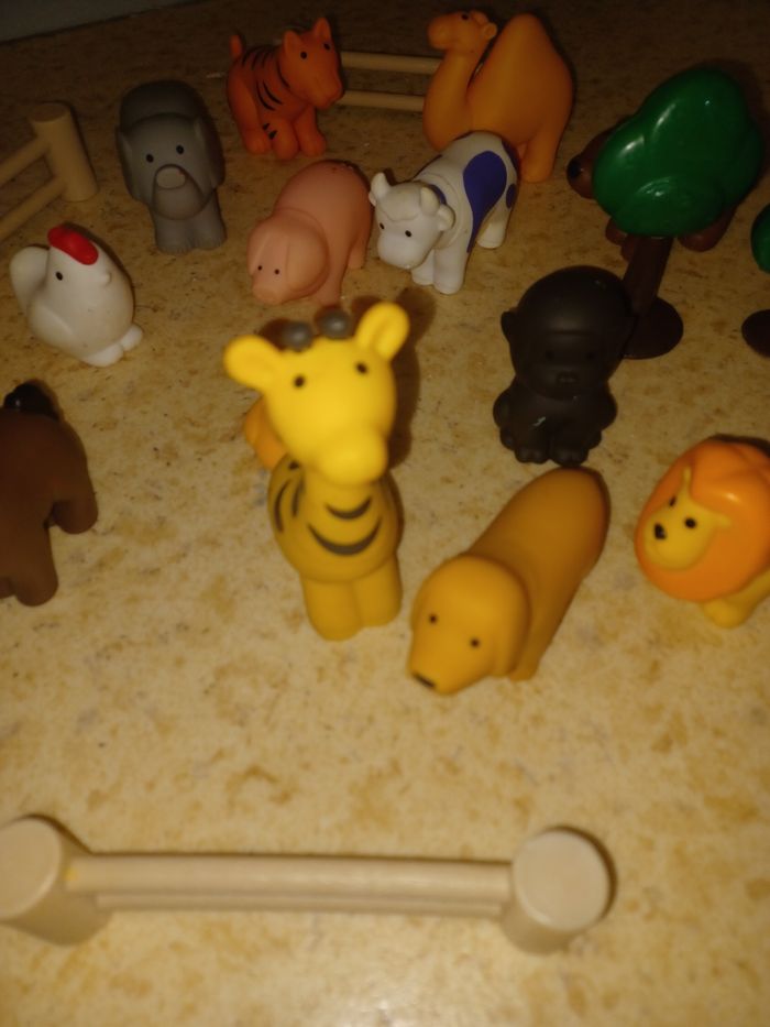 Lot de 14 animaux en plastique mou parfait pour 1er âge 2 arbres 🌳 un sapin et 4 barrières. Parfait état.