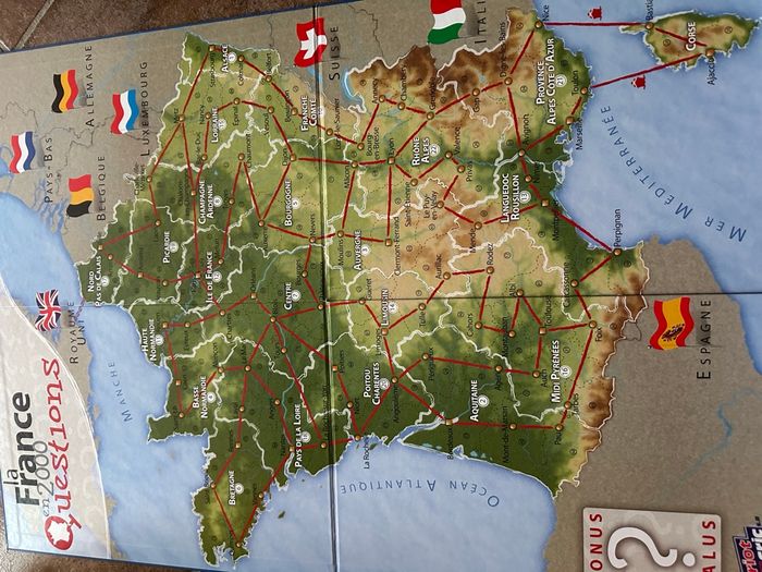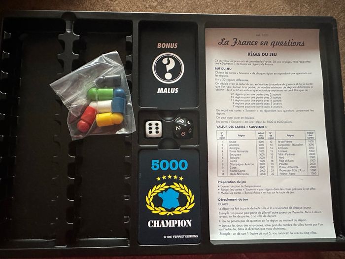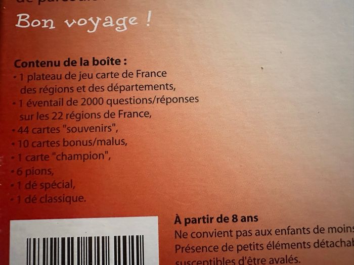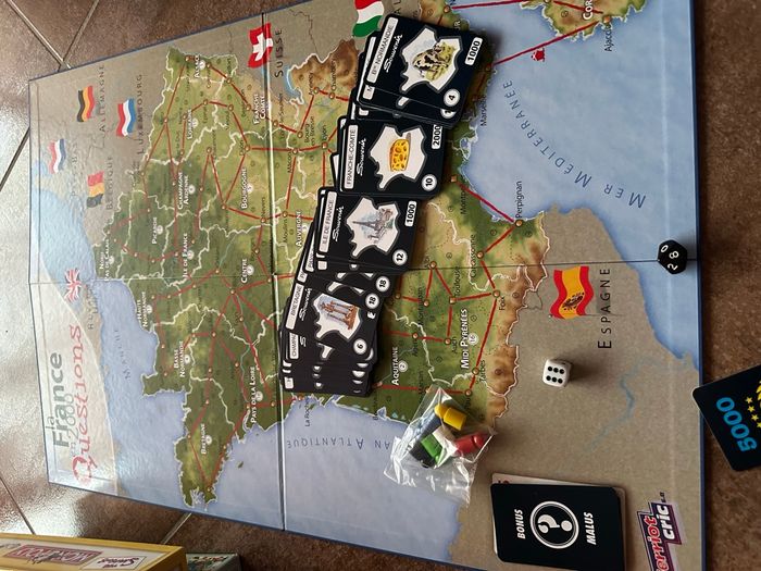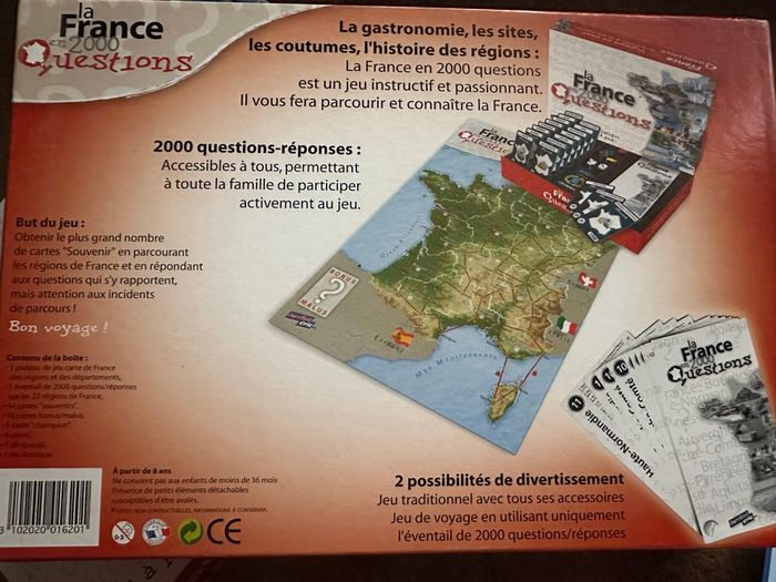 Ce jeu complet comprend un grand plateau de jeu mettant en avant les grandes villes de France, un ensemble de 2000 questions-réponses, 55 cartes à jouer, 6 pions, 1 dé spécial et 1 dé classique.