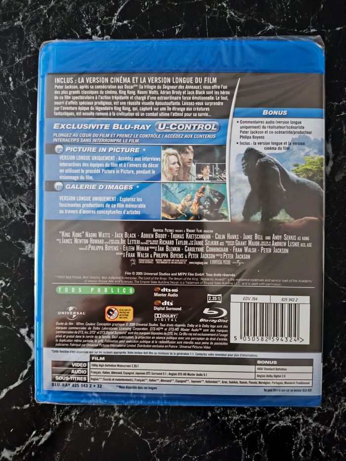 Film King Kong (2005) neuf encore sous blister. Aventure et fantastique de Peter Jackson avec Naomi Watts, Jack Black, Adrien Brody, Andy Serkis et Thomas Kretschmann. Plusieurs autres films (DVD et blu-ray) et séries télé disponibles sur mon dressing. Si vous avez des questions ou souhaitez plus de photos, n'hésitez pas à me demander. Prix négociable seulement si vous achetez plusieurs articles. N'hésitez pas à créer un lot et à faire une proposition raisonnable et à me demander un prix. Tag de recherche : #neboo_video #neboo_bluray #neboo_film blu ray bluray langue français française French FR
