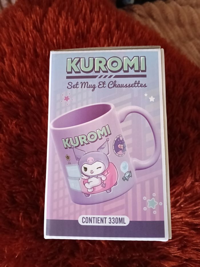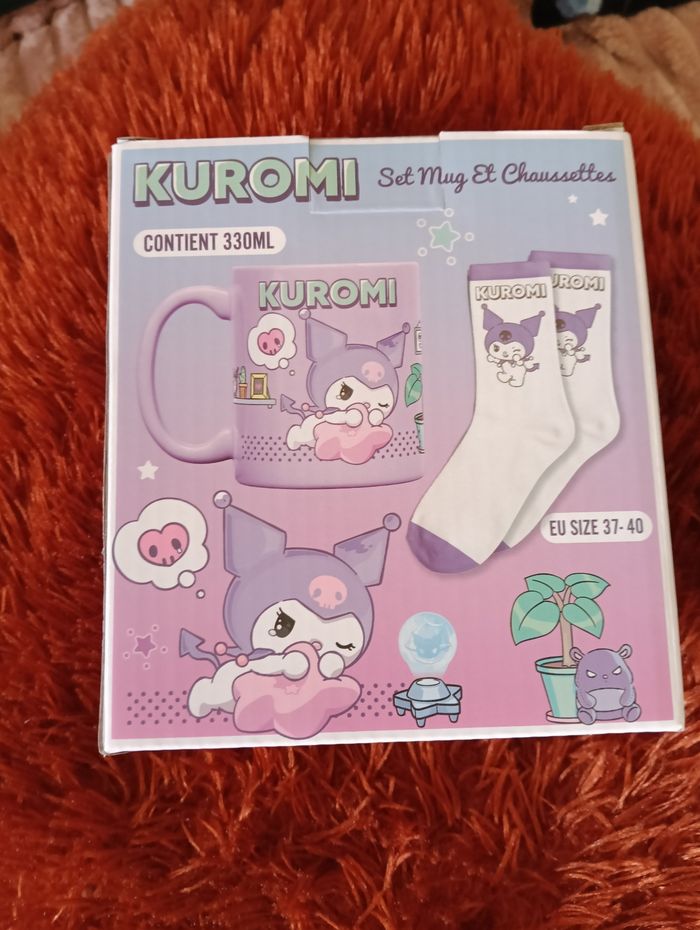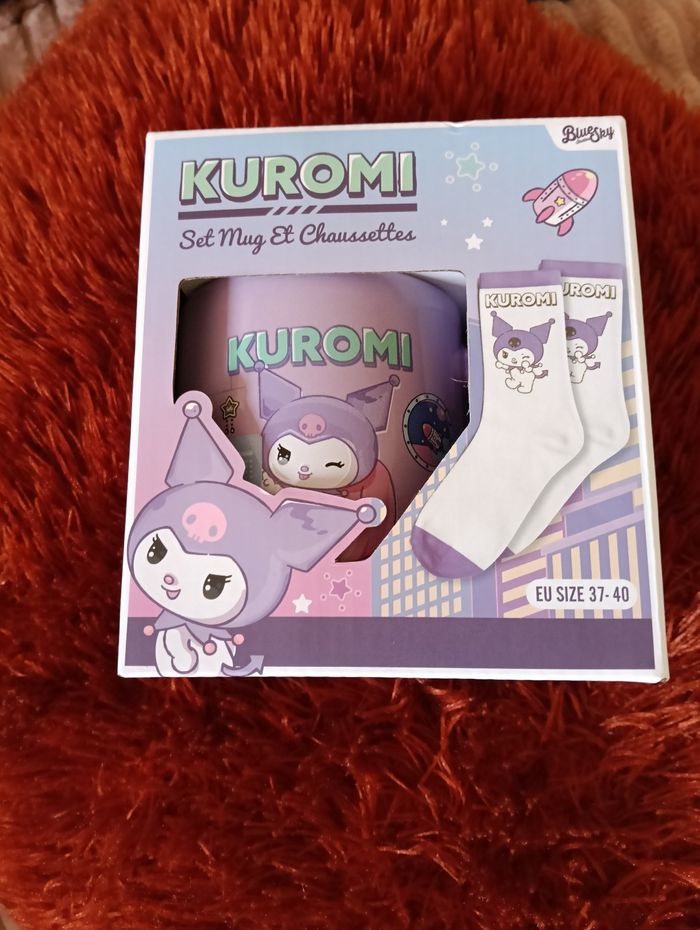 Set ensemble mug et chaussettes dans une boîte cadeau Kuromi Taille chaussettes 37/40 Produits neufs idéal pour cadeau de Noël anniversaire ou autres occasions