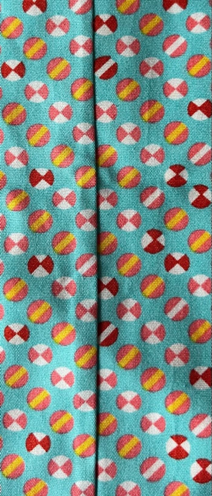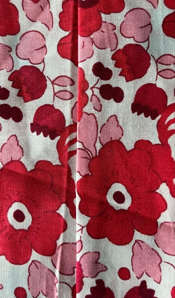 Magnifique tissu de récupération (en forme de bande). Cousu donc déplier doublé la largeur. Motifs fleurs/ géométrique. Parfait pour tous vos projets de coutures. Dimensions : - 4 chutes de 6,5 cm x 50 cm. - 2 chutes de 4 cm x 41 cm. N’hésitez pas si vous avez des questions ou besoin de plus de photos.