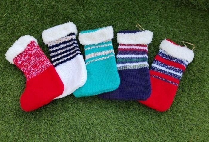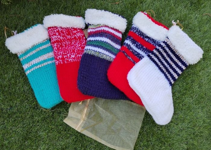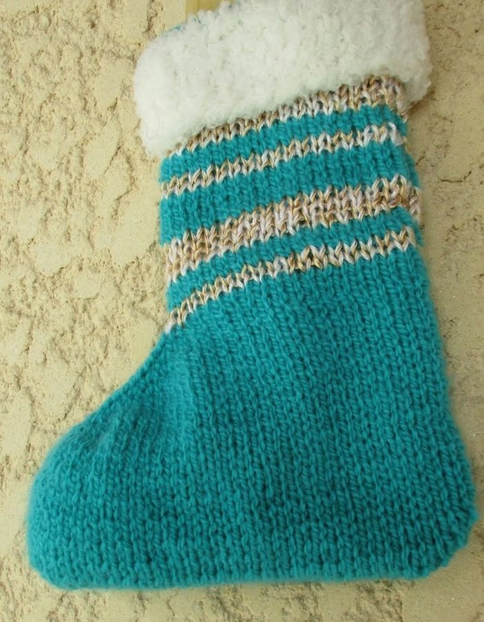 Grande Chaussette de Noël 🎅 🎄 à suspendre, au tricot, 100 % acrylique, env 17 x 24 cm, rayures vert blanc doré, large revers en fil peluche blanc de 4 cm, attache ruban brillant doré, fourni avec un sachet en Organza doré (21 x x 13,5 cm), pour y glisser des petits cadeaux, gourmandises, jouets, maquillage etc 👍 🎄 pensez à profiter de la réduction sur les lots avec d'autres modèles disponibles 👍 🎄 🎅