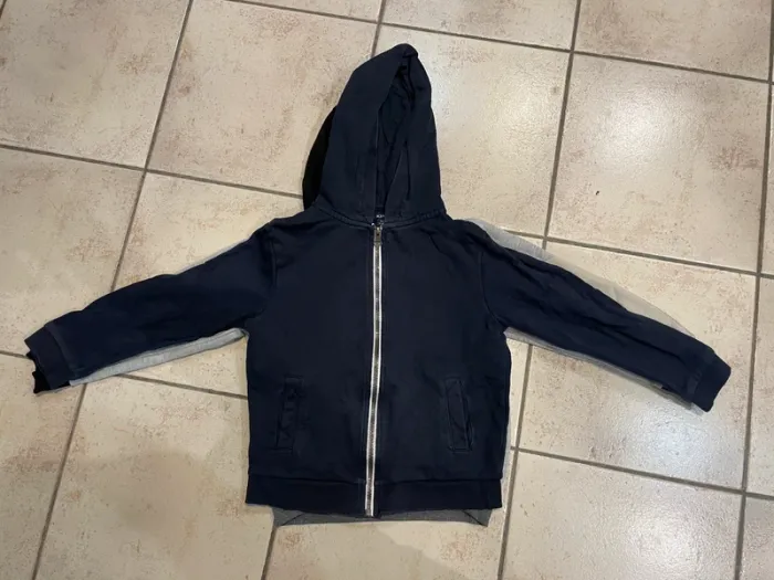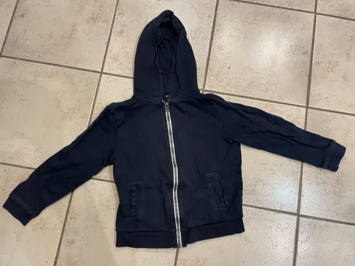 Sweat fin à capuche, zippé sur le devant Marque Kiabi Couleur bleu foncé. Indiqué en taille 8ans mais il taille petit, je me mettais à mon fils en même temps que d'autre sweats en 6ans. Sur la dernière photo je l'ai superposé avec un autre sweat 6ans (je me permet de le classer en 6ans dans l'annonce mais l'étiquette indique 8ans..)