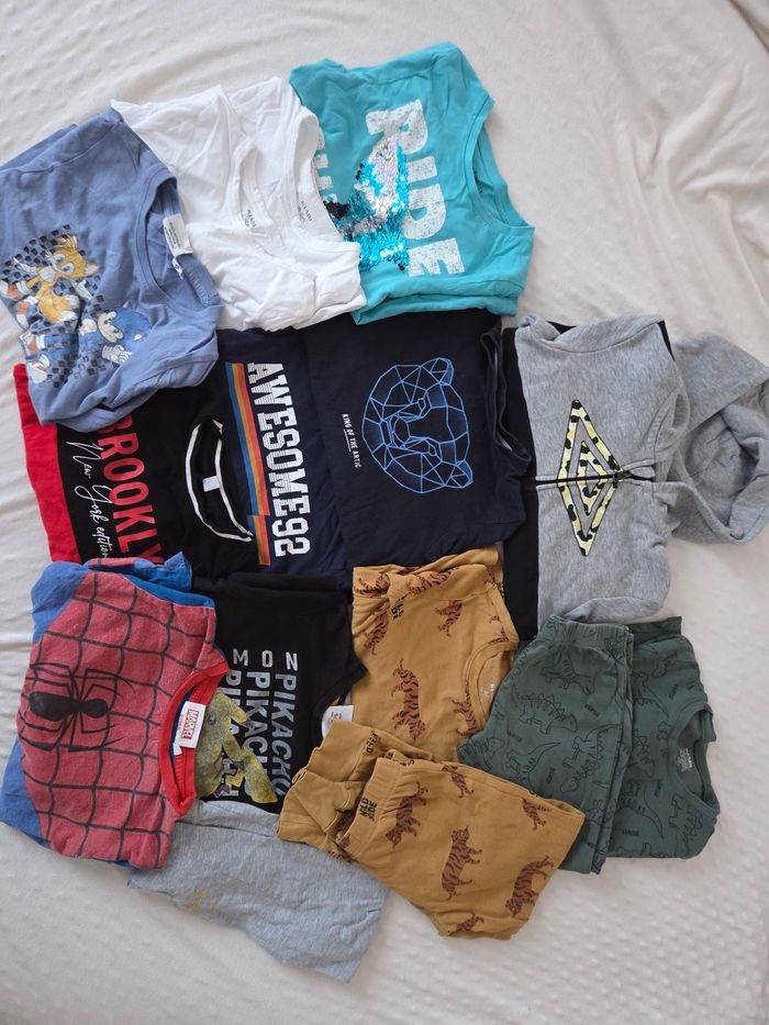 Très bon état. Veste avec capuche umbro . 4 t-shirts manches courtes. 3 t-shirts manches longues . 3 ensembles pyjamas Et un haut pyjama manches longues
