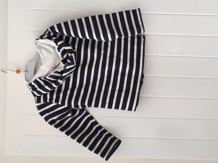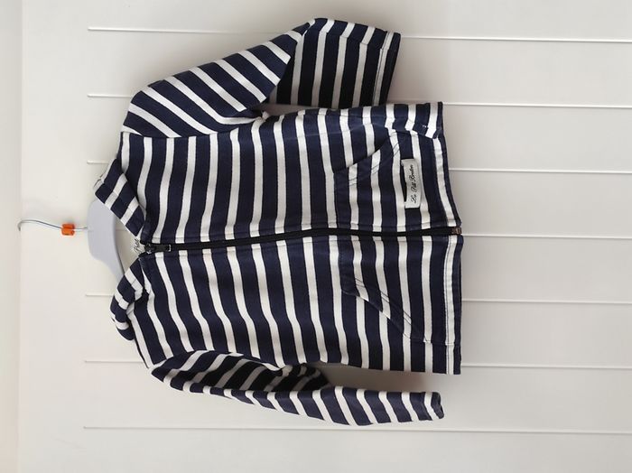 "Veste zippée à capuche pour garçon, parfaite pour la mi-saison 👦🧥 Taille : petit 4 ans Motif : rayures Coloris : marine et blanc Fermeture : zip sur le devant Capuche : oui État : très bon état général 🔍 À noter : Une micro tache en bas de la veste (voir dernière photo). Elle reste discrète et la veste est encore très jolie et tout à fait portable."