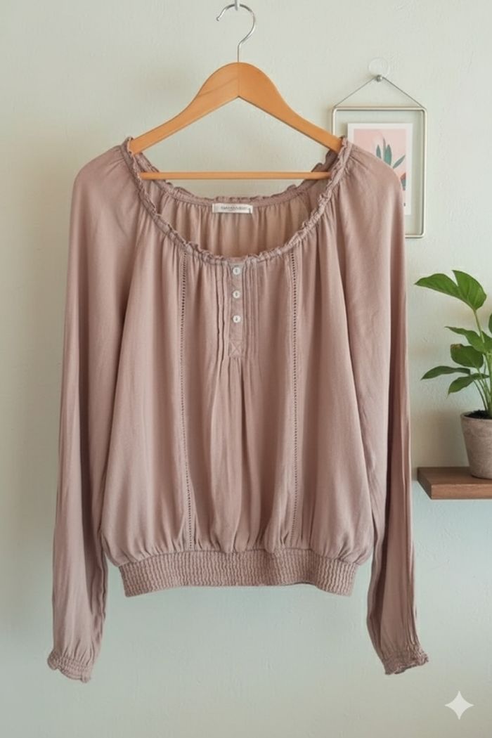 Ce chemisier se distingue par son tissu fluide et léger pour un confort optimal. Il présente une encolure froncée élastique, des manches longues et un bas smocké qui souligne délicatement la taille, Les petits boutons sur le devant et les détails de couture travaillés lui confèrent beaucoup de charme.