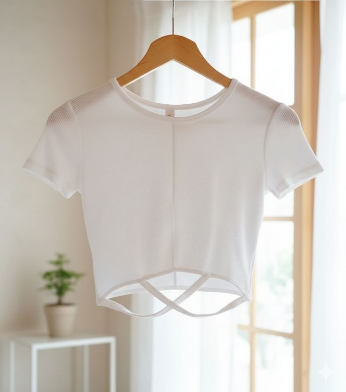 Adoptez le style avec ce magnifique crop top blanc ! Parfait pour un look décontracté stylé. Son tissu côtelé et les détails croisés à la taille apportent une touche d'originalité. Confort et tendance assurés !