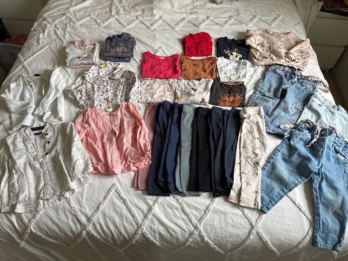 Lot vêtement fille 24 mois Ce lot comprend : 8 leggings 3 jeans 3 chemises 8 tee shirt manches longues 1 pull 1 gilet 2 pijamas Marques : tape à l’œil, Kiabi, vertbaudet
