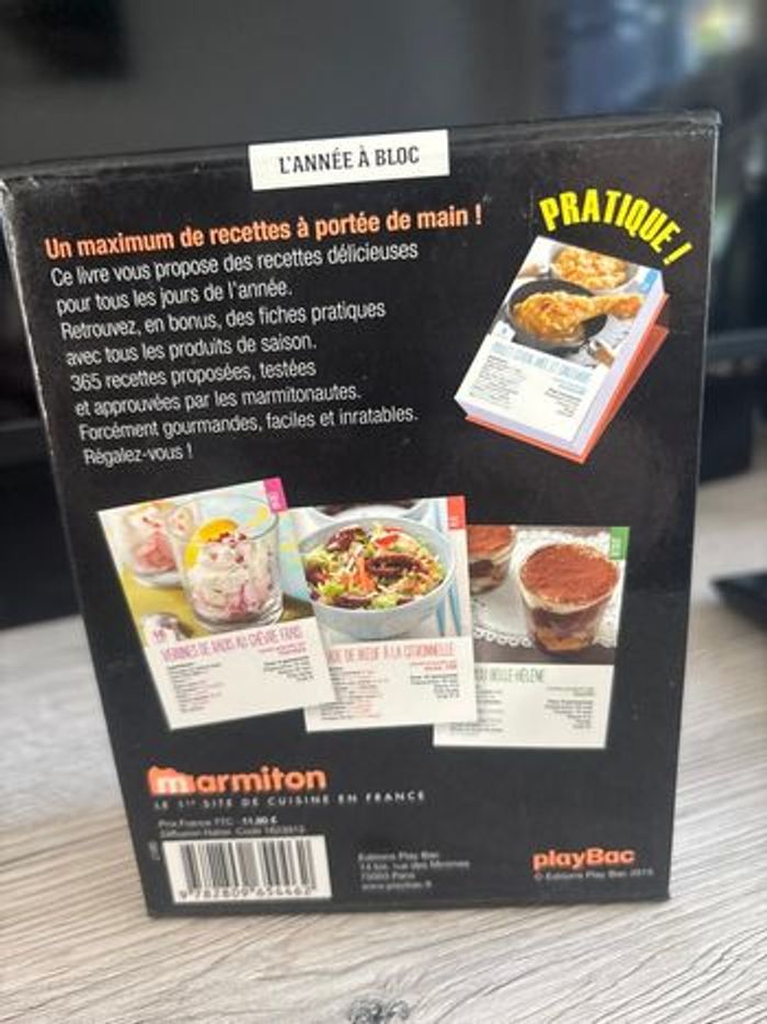 Vends bloc de 365 jours avec chaque jour une nouvelle recette Marmiton Les fiches recettes sont en très bon état, le bloc pour les ranger est un peu abîmé (voir photos) Prix d’achat 11,90€